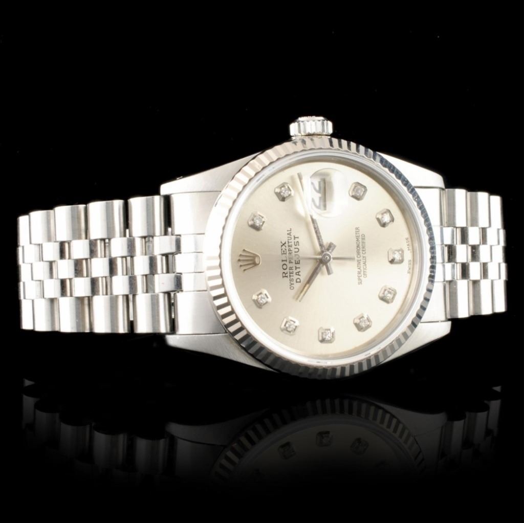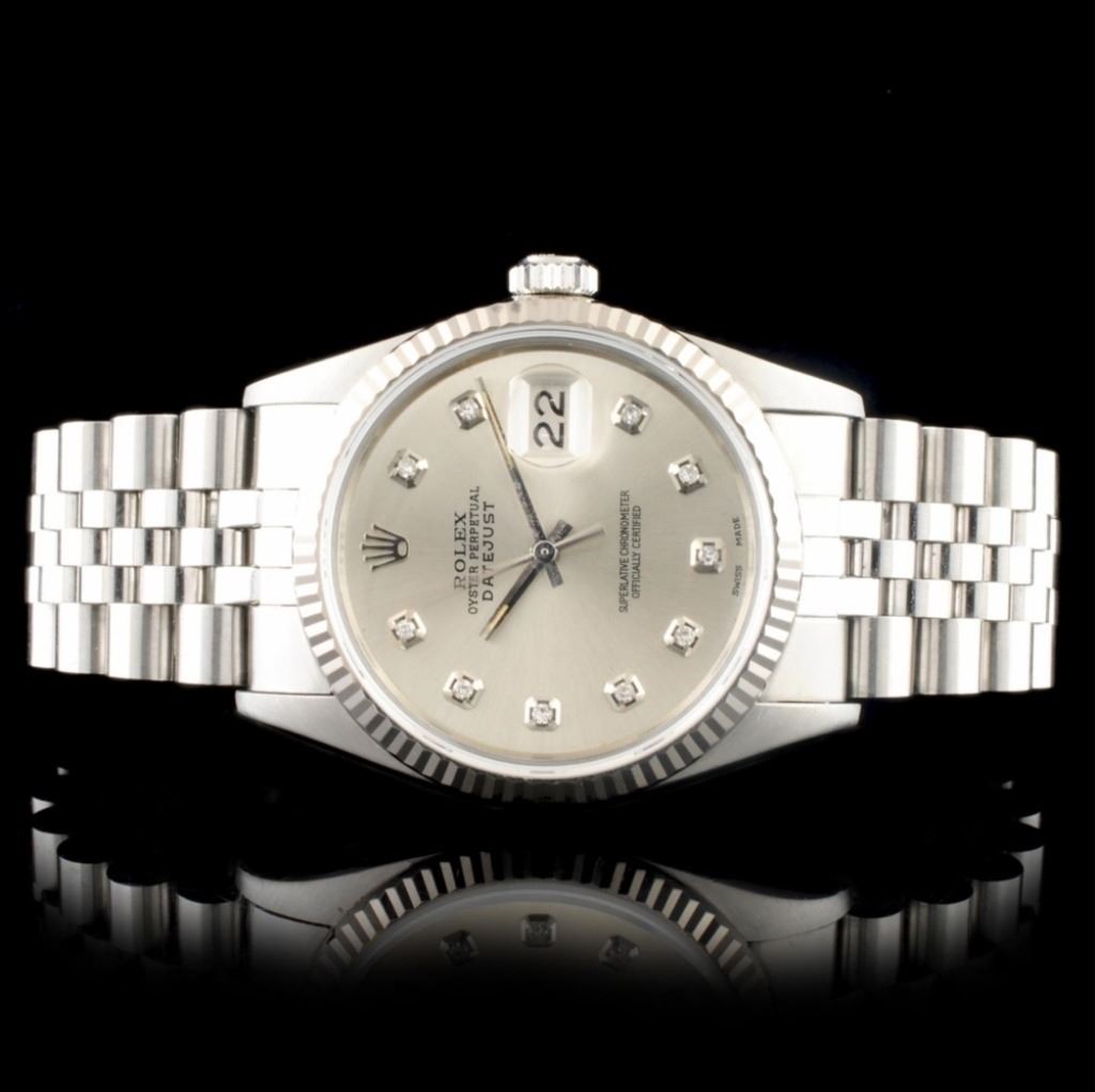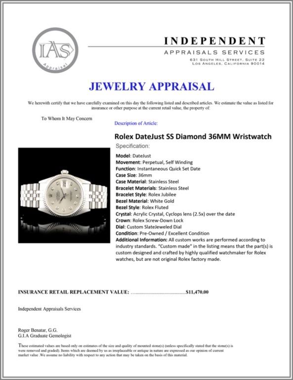 Estimated Retail Replacement Value: $11,470.00Ref: BAS14000Item No.: ARXAA-0025Specification:Documents: Appraisal ReportModel: DateJustMovement: Perpetual, Self WindingFunction: Instantaneous Quick Set DateCase Size: 36mmCase Material: Stainless Steel Bracelet Materials: Stainless Steel Bracelet Style: Rolex JubileeBezel Material: White GoldBezel Style: Rolex FlutedCrystal: Acrylic Crystal, Cyclops lens (2.5x) over the dateCrown: Rolex Screw-Down LockDial: Custom SlateJeweled Dial Condition: Pre-Owned / Excellent Condition*Additional Information: All custom works are performed according to industry standards. ÒCustom madeÓ in the listing means that the part(s) is custom designed and crafted by highly qualified watchmaker for Rolex watches, but are not original Rolex factory made. Great Condition - Shipping notes: We ship 4-10 Business day after the clearance of payment. Tracking numbers are emailed once the package(s) are shipped. Most shipments are sent by FEDEX Priority, UPS Priority, or US PRIORITY MAIL INSURED