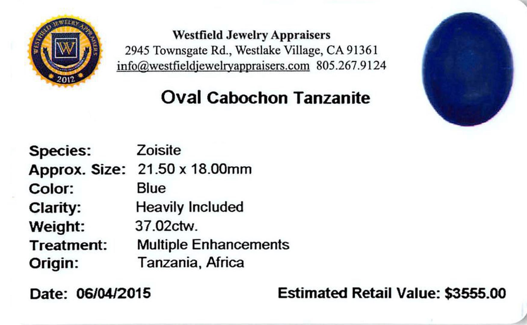 One oval cabochon cut natural tanzanite, measuring 21.50 x 18.00 x 10.00mm, exact weight 37.02ct., clarity is heavily included, type I, dark, very slightly grayish, blue color, (GIA B 7/3), cut is good. Transmitting light somewhat diffusely, transparent to translucent. Naturally occurring internal & external characteristics are present. Indications of heat treatment. Westfield Appraised at $3,555.00.