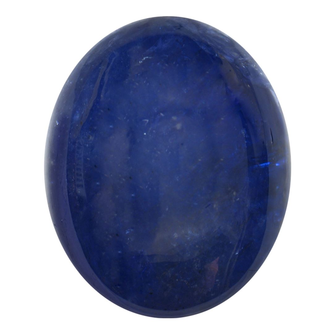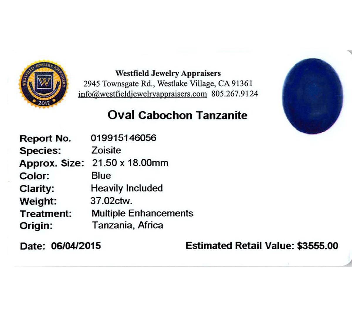 One oval cabochon cut natural tanzanite, measuring 21.50 x 18.00 x 10.00mm, exact weight 37.02ct., clarity is heavily included, type I, dark, very slightly grayish, blue color, (GIA B 7/3), cut is good. Transmitting light somewhat diffusely, transparent to translucent. Naturally occurring internal & external characteristics are present. Indications of heat treatment. Westfield Appraised at $3,555.00.