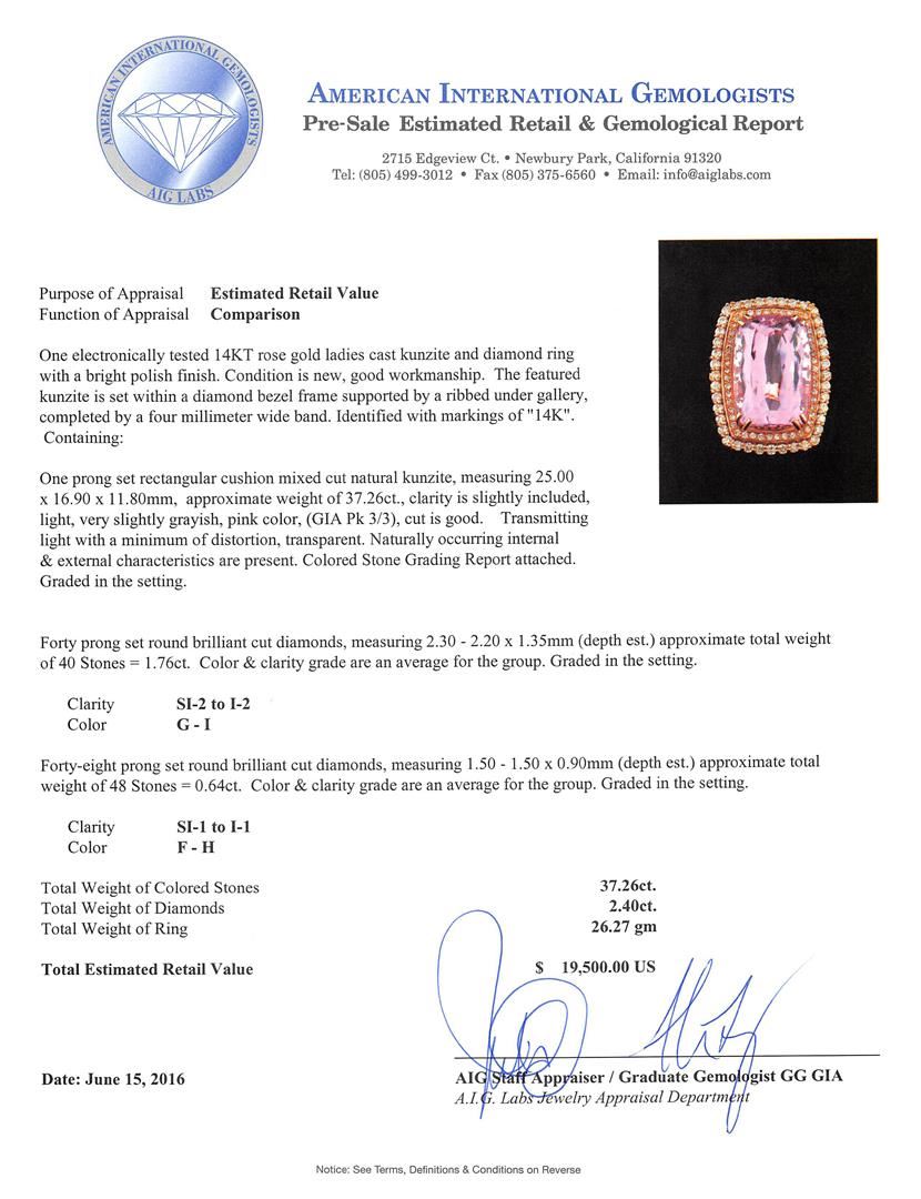 One electronically tested 14KT rose gold ladies cast kunzite and diamond ring with a bright polish finish. The featured kunzite is set within a diamond bezel frame supported by a ribbed under gallery, completed by a four millimeter wide band. Identified with markings of "14K". Condition is new, good workmanship. Containing: One prong set rectangular cushion mixed cut natural kunzite, measuring 25.00 x 16.90 x 11.80mm, approximate weight of 37.26ct., clarity is slightly included, light, very slightly grayish, pink color, (GIA Pk 3/3), cut is good. Transmitting light with a minimum of distortion, transparent. Naturally occurring internal & external characteristics are present. Colored Stone Grading Report attached. Graded in the setting. Forty prong set round brilliant cut diamonds, measuring 2.30 - 2.20 x 1.35mm (depth est.) approximate total weight of 40 Stones = 1.76ct. Color & clarity grade are an average for the group. Graded in the setting. Clarity: SI-2 to I-2. Color: G - I Forty-Eight prong set round brilliant cut diamonds, measuring 1.50 - 1.50 x 0.90mm (depth est.) approximate total weight of 48 Stones = 0.64ct. Color & clarity grade are an average for the group. Graded in the setting. Clarity: SI-1 to I-1. Color: F - H. Total Weight of Colored Stones 37.26ct. Total Weight of Diamonds 2.40ct. Total Weight of Ring 26.27gm. AIG Appraised at $19,500.00.