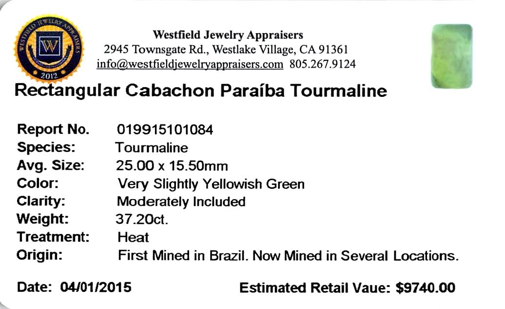 One rectangular cabochon cut natural Paraiba tourmaline exact weight 37.20ct., clarity is moderately included, cut is good. Westfield Appraised at $9,740.00.