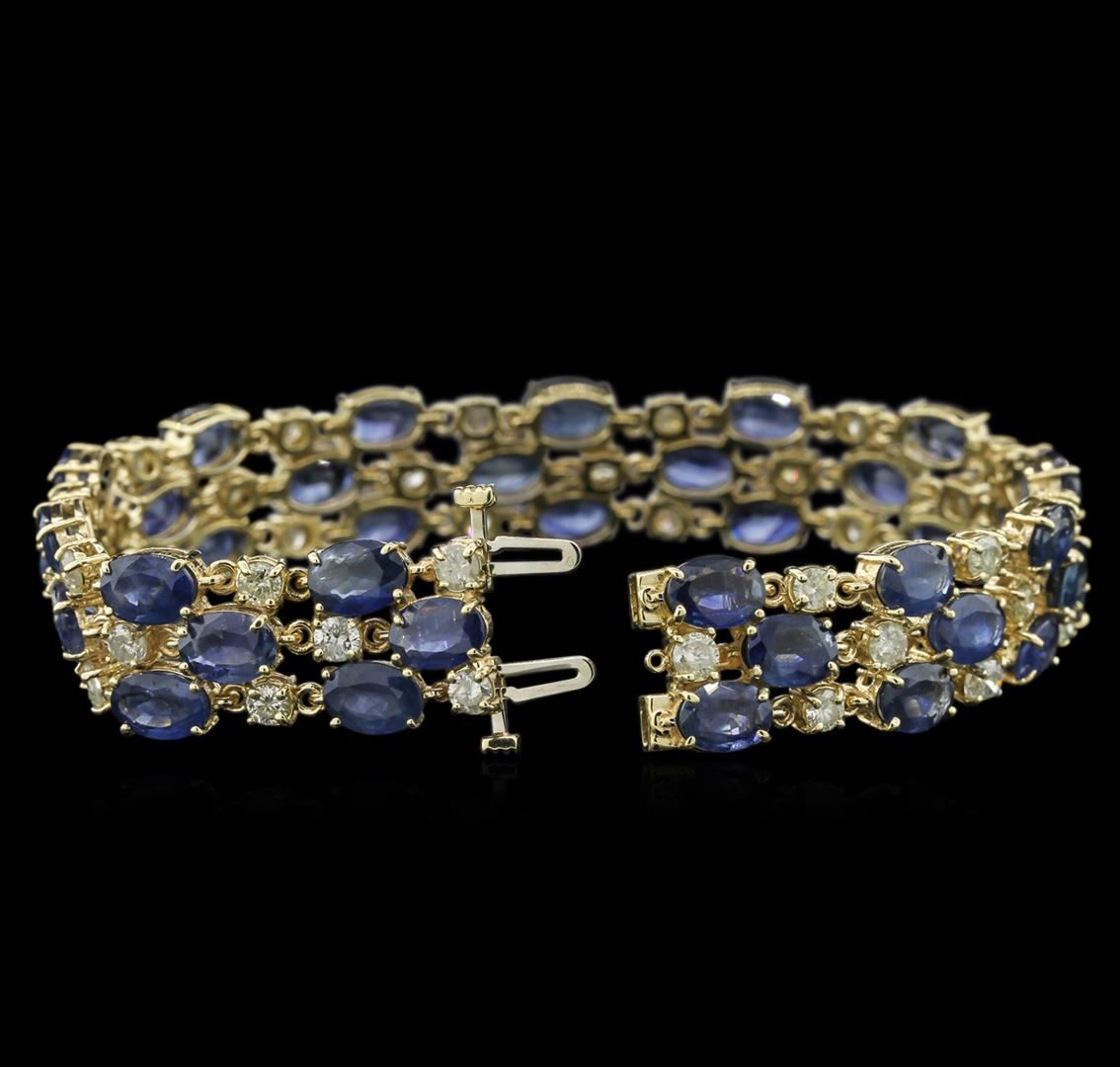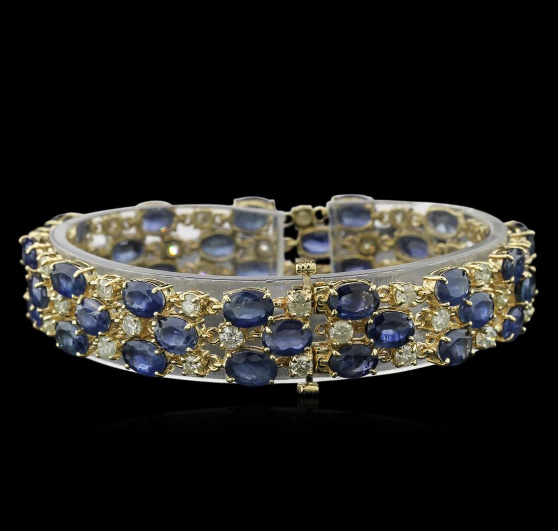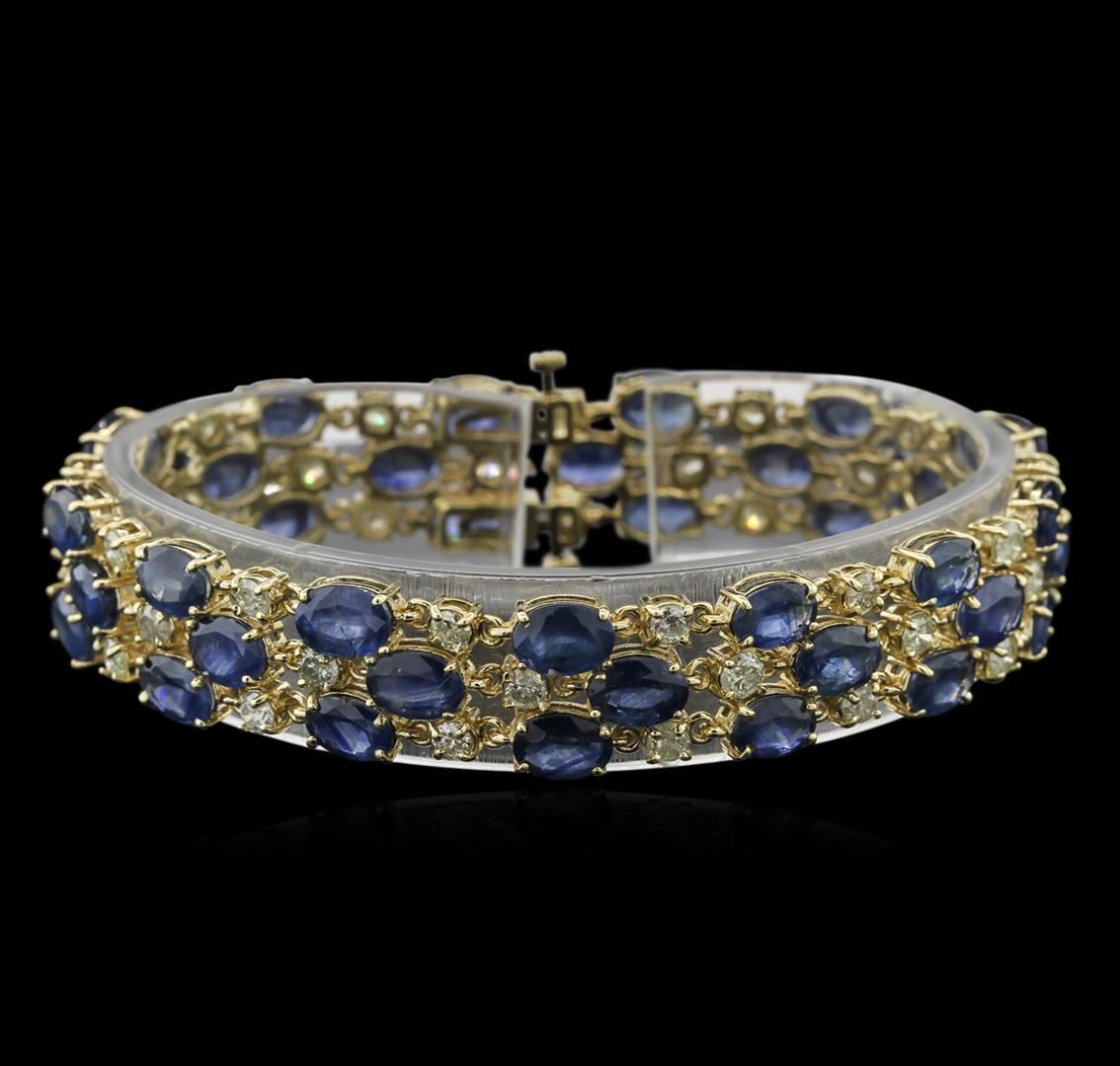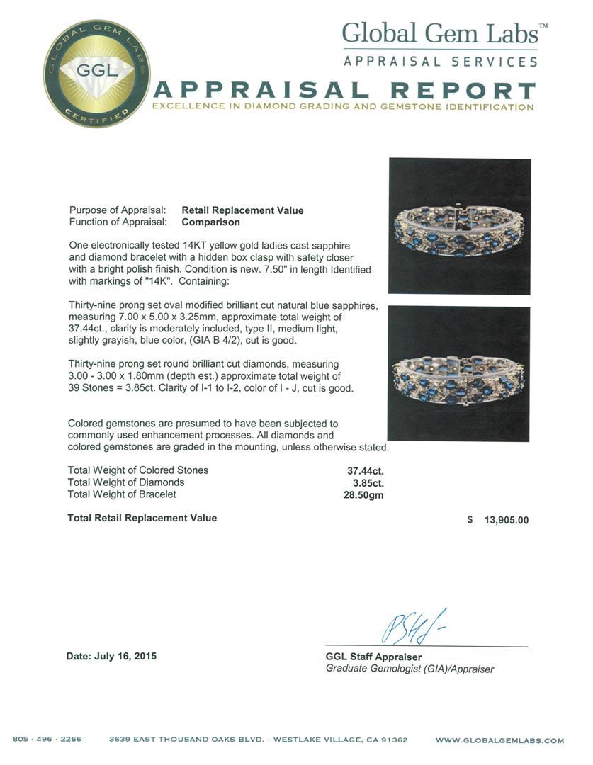 One electronically tested 14KT yellow gold ladies cast sapphire and diamond bracelet with a hidden box clasp with safety closer with a bright polish finish. 7.50" in length Identified with markings of "14K". Condition is new. Containing: Thirty-nine prong set oval modified brilliant cut natural blue sapphires, measuring 7.00 x 5.00 x 3.25mm, approximate total weight of 37.44ct., clarity is moderately included, type II, medium light, slightly grayish, blue color, (GIA B 4/2), cut is good. Thirty-Nine prong set round brilliant cut diamonds, measuring 3.00 - 3.00 x 1.80mm (depth est.) approximate total weight of 39 Stones = 3.85ct. Clarity: I-1 to I-2. Color: I - J, Cut is Good. Colored gemstones are presumed to have been subjected to commonly used enhancement processes. All diamonds and colored gemstones are graded in the mounting, unless otherwise stated. Total Weight of Colored Stones 37.44ct. Total Weight of Diamonds 3.85ct. Total Weight of Bracelet 28.50 grams. GGL Appraised at $13,905.00.