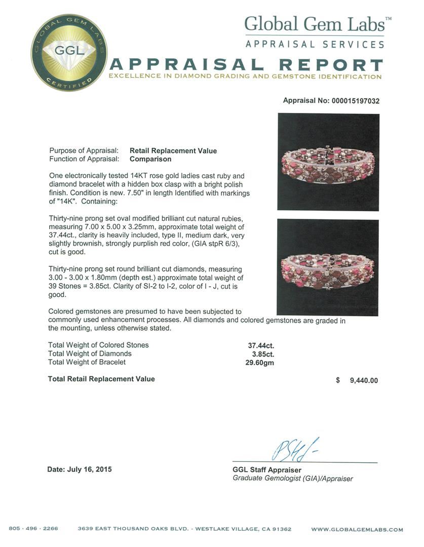 One electronically tested 14KT rose gold ladies cast ruby and diamond bracelet with a hidden box clasp with a bright polish finish. 7.50" in length Identified with markings of "14K". Condition is new. Containing: Thirty-nine prong set oval modified brilli GGL Appraised at $9,440.00.