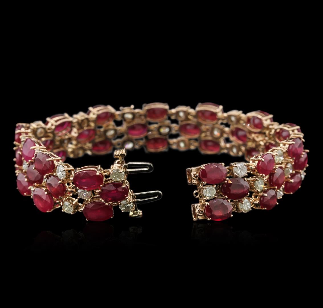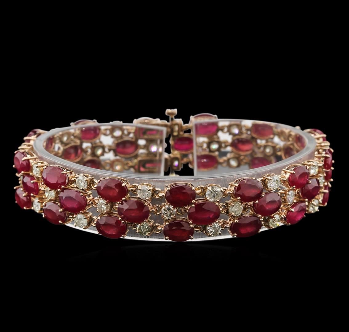 One electronically tested 14KT rose gold ladies cast ruby and diamond bracelet with a hidden box clasp with a bright polish finish. 7.50" in length Identified with markings of "14K". Condition is new. Containing: Thirty-nine prong set oval modified brilliant cut natural rubies, measuring 7.00 x 5.00 x 3.25mm, approximate total weight of 37.44ct., clarity is heavily included, type II, medium dark, very slightly brownish, strongly purplish red color, (GIA stpR 6/3), cut is good. Thirty-Nine prong set round brilliant cut diamonds, measuring 3.00 - 3.00 x 1.80mm (depth est.) approximate total weight of 39 Stones = 3.85ct. Clarity: SI-2 to I-2. Color: I - J, Cut is Good. Colored gemstones are presumed to have been subjected to commonly used enhancement processes. All diamonds and colored gemstones are graded in the mounting, unless otherwise stated. Total Weight of Colored Stones 37.44ct. Total Weight of Diamonds 3.85ct. Total Weight of Bracelet 29.60 grams. GGL Appraised at $9,440.00.