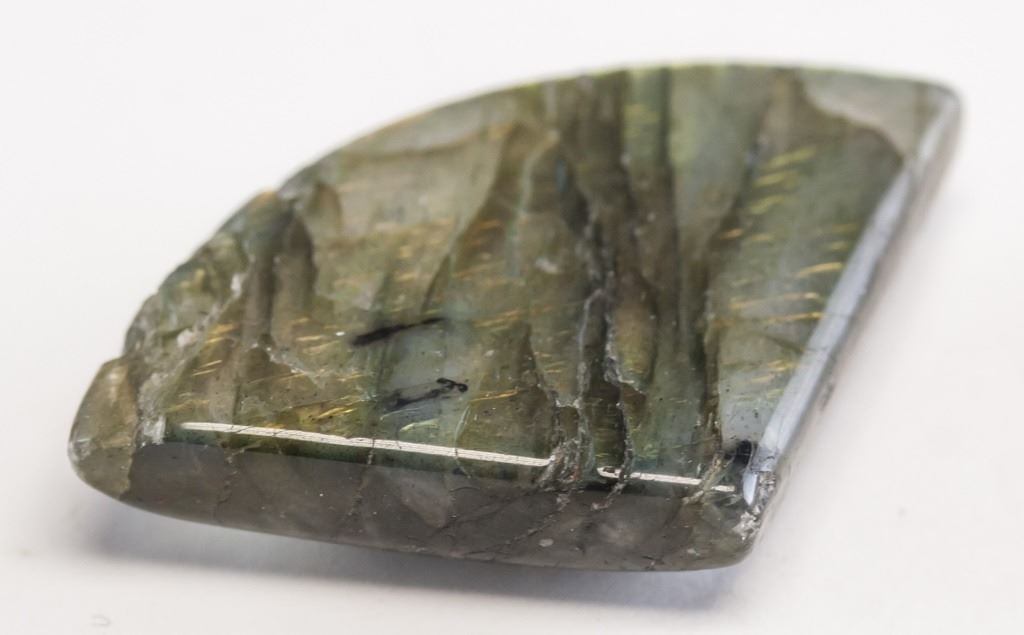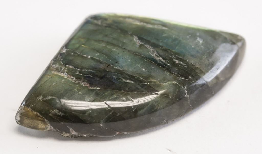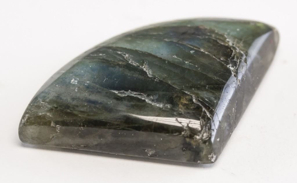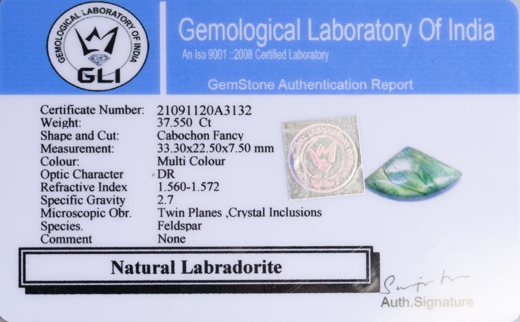 37.55 ct cabochon fancy cut multi-color natural labradorite. Accompanied with GLI certificate. 33.30 x 22.50 x 7.50 mm.