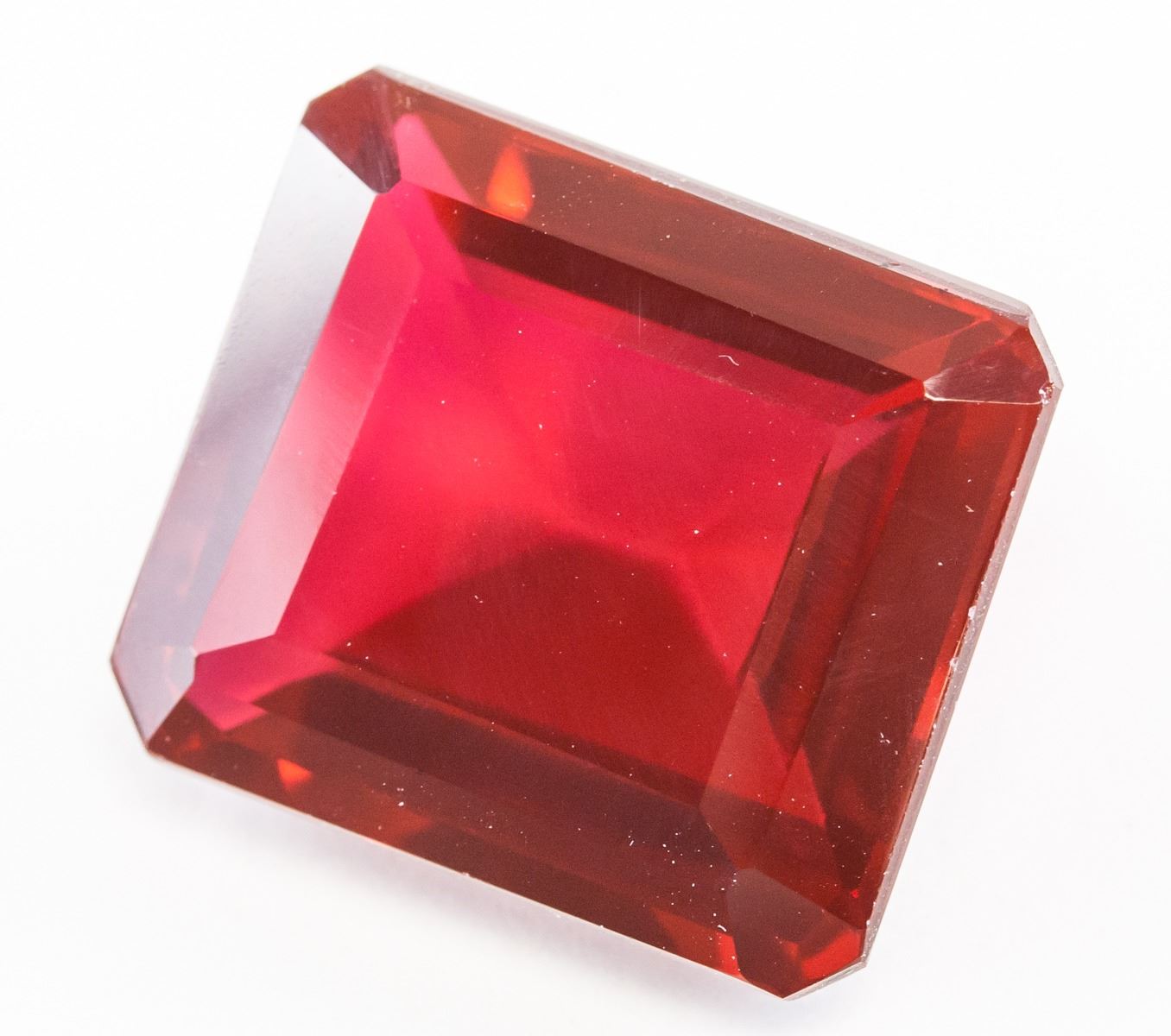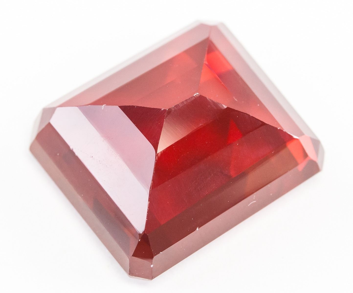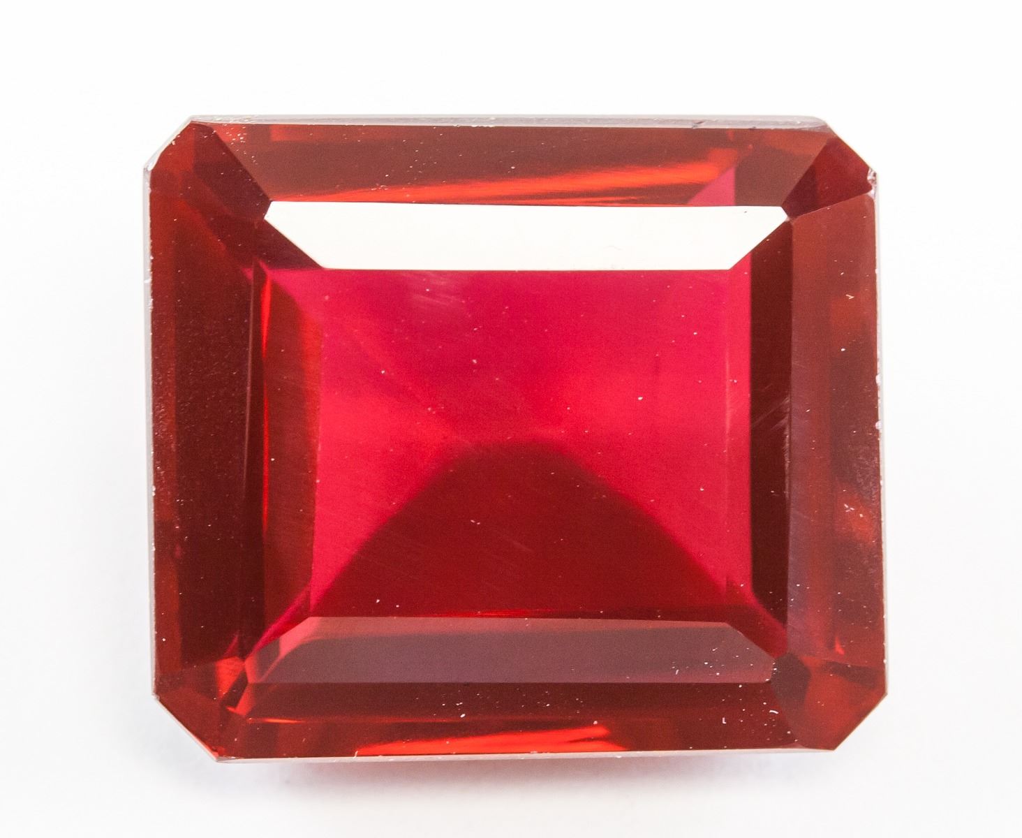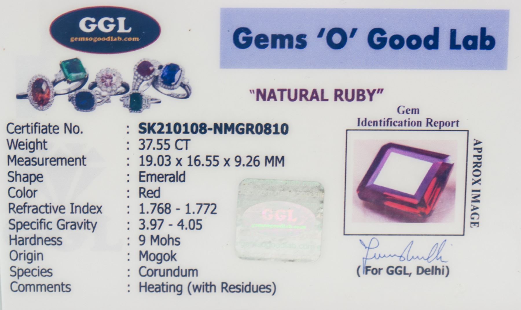 One (1) 37.55 ct emerald cut red natural ruby. Origin: Mogok. Accompanied with GGL certificate. 19.03 x 16.55 x 9.26 mm.