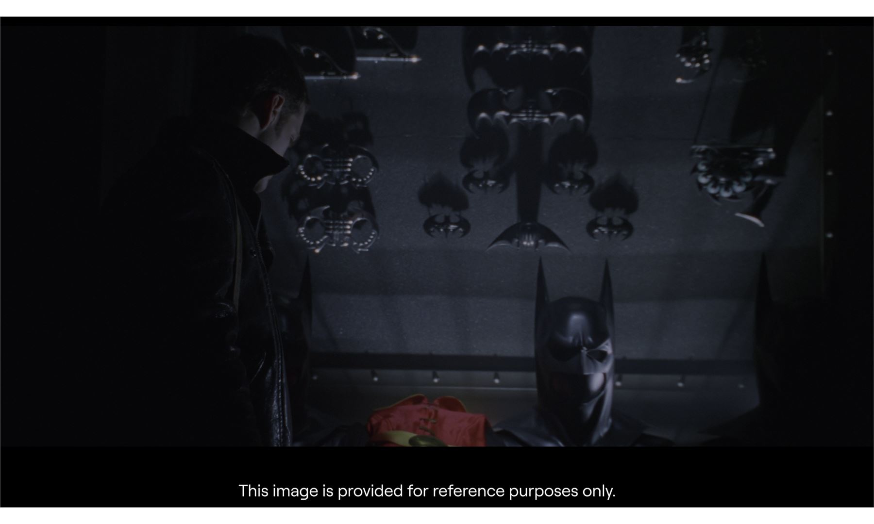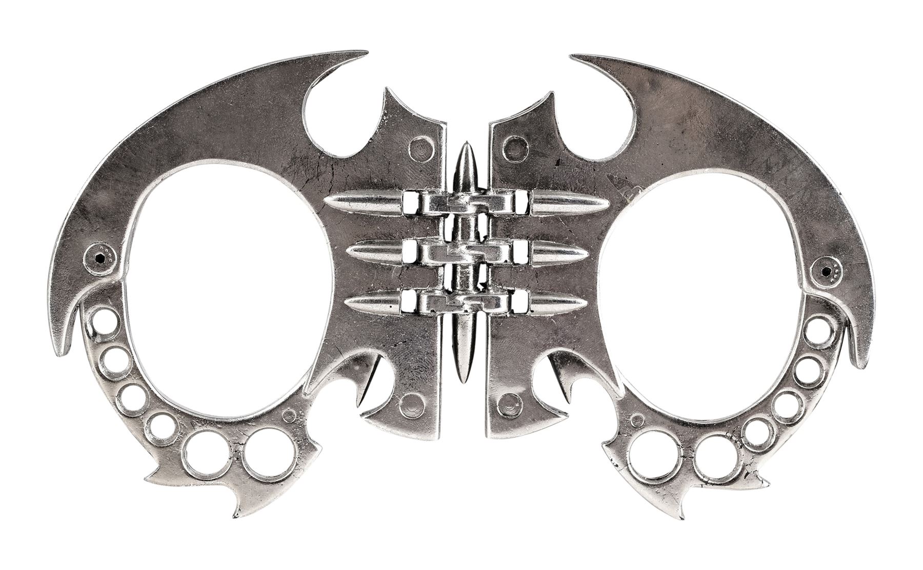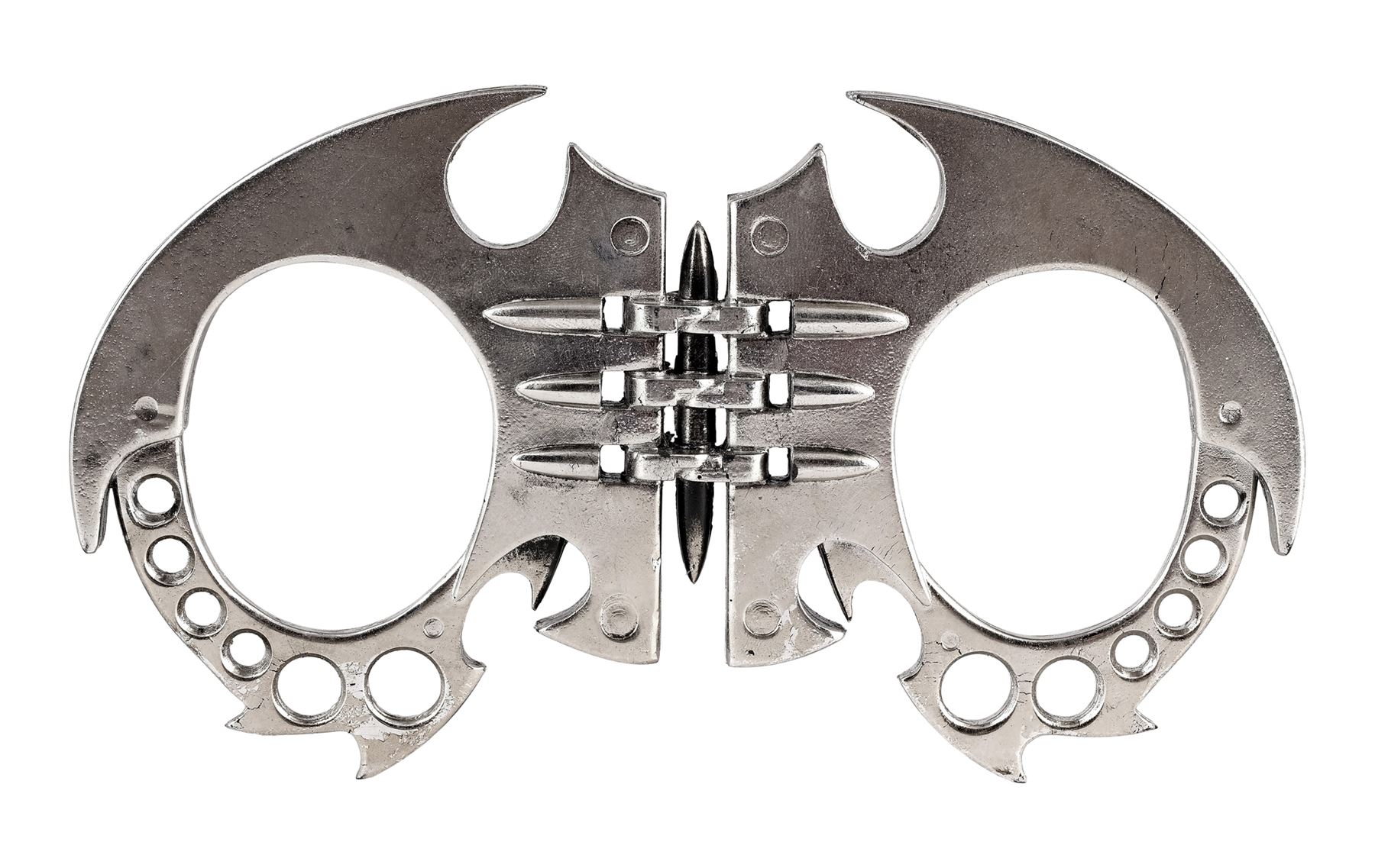 BATMAN FOREVER (1995) - Batman's (Val Kilmer) Bat-Cuffs - Batman's (Val Kilmer) bat-cuffs from Joel Schumacher's Batman Forever. Batman kept his bat-cuffs in the Batcave below Wayne Manor before the Batcave was destroyed by Two-Face (Tommy Lee Jones) and The Riddler (Jim Carrey).