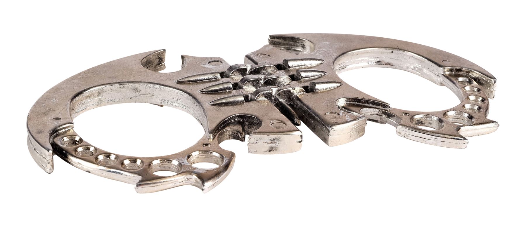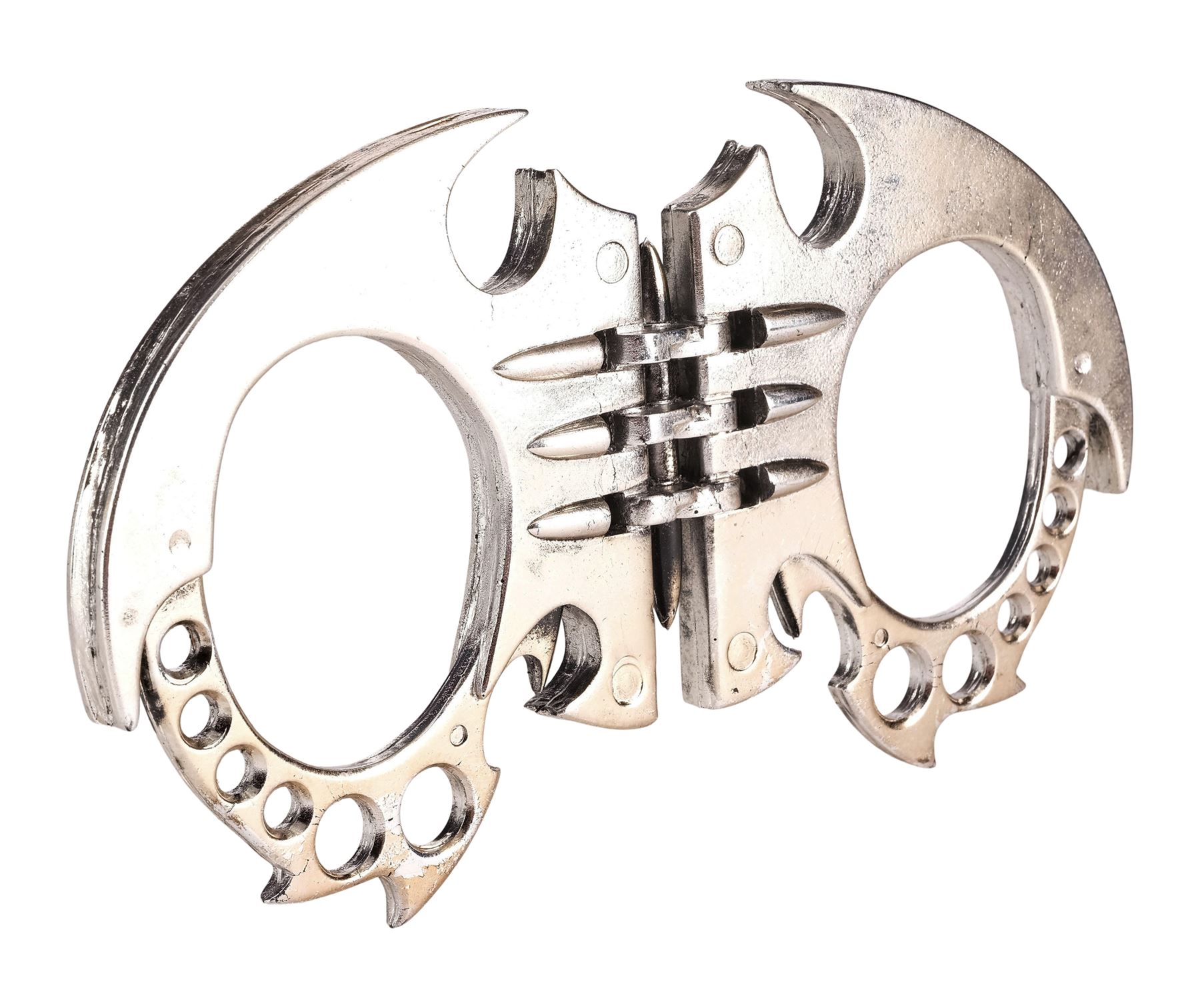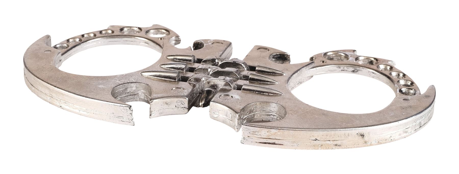 This lot consists of a pair of silver-color painted dense rubber static cuffs shaped like a bat. These cuffs exhibit chipped paint throughout. Dimensions: 8.5" x 5" x 0.5" (21.75 cm x 12.75 cm x 1.5 cm)