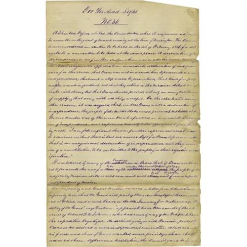 <B>Archive of Manuscripts of Articles Written for the Newspaper </B></I><B><I>The Headlight</B></I></B></I> A total of 37 manuscript drafts, most 3 to 4 pp. in length, 8" x 12.5", n.p., n.d., but likely late 19th Century, comprising a series of articles submitted to a newspaper recounting the story of the Texas War for Independence. Great content giving detail and insight to both sides (Texan and Mexican) as well as providing a primary source for how events were perceived and honored at the time of publishing. There are a total of 37 transcripts, meaning that there was great interest in the story. We have been unable to identify the specific newspaper these stories have been published in, but have located two possibilities for small local Texas papers that were established in the 1890's: <I>The Kenedy Headlight</B></I>, and <I>The Eagle Lake Headlight</B></I>. The paper used is lined, with a small embossed imprint at the top left corner, stationery commonly used during that time.<BR><BR>The transcripts read, in very small part: "<I>No. 36... It was believed by many of the leading men in Texas that if Texas continued to... the war for her rights under the constitution of 1824, the people of the adjoining Mexican states would soon unite with her together, and form a republic independent of Mexico. On his journey west, General Houston received a letter from General Bowie informing him that Dr. Grant with part of the volunteers left at Bexar, arrived at Goliad, and would leave on the 11th January for Matamoras. 'The delay of Dr. Grant,' says Yoakam, 'appears to have been caused by the absence of Colonel F. W. Johnson, who had come by way of San Felipe, to have the expedition </B></I>[?]<I>...</B></I> <I>No. 43 Santa Anna, after hs success at Bexar, seems to have considered teh war at an end, and determined to return to the Capitol. Colonel Almonte seems to have been of the same opinion... Having refreshed his troops... Santa Anna, on the 11th of March, ordered Generals Sesina and Woll, with six hundred and seventy five infantry, fifty dragoons, two six-pounders, and eight days rations, towards to San Felipe, and thence to Anahuac </B></I>[established as the capitol of Texas by the Mexican government] <I> by way of Harrisburg. Colonel Juan Morales, with two battalions, some four hundred men, one mortar, one eight and one twelve-pounder, and a months rations, was ordered to Goliad. Before making further dospostions of his forces, he was informed by Urrea tjat Fannin was at Goliad and would defend the place. Sesina informed him that the Texans were on the left bank...</B></I>" The serial unfolds much like a historical novel, with gripping content throughout. With dampstaining, wear along the folds, and chipping at margins; overall condition is good. All sheets remain easily legible.<BR><BR><b>Shipping:</b> Books & Catalogs (<a target="_blank" href="http://www.heritageauctions.com/common/shipping.php">view shipping information</a>)