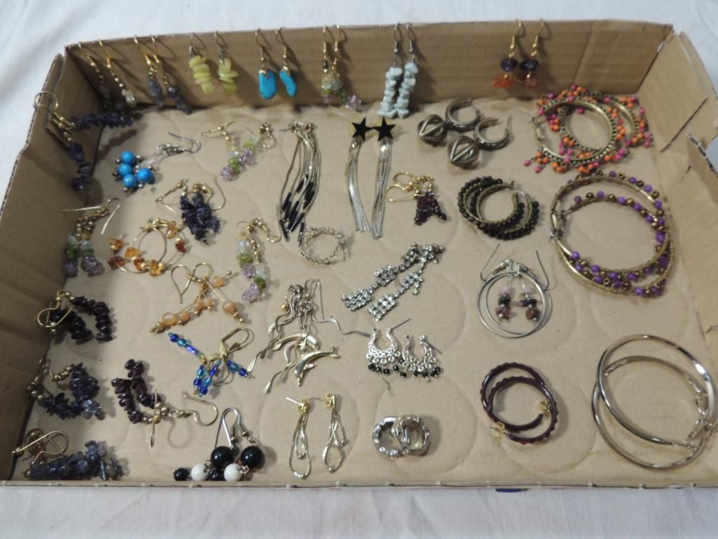 DANGLING EARRINGS. FASHION JEWELRY. HOOPS, STONE, BEAD, METAL. SILVERTONE, GOLDTONE. AS SHOWN. SEE PHOTO FOR MORE DETAILS.
