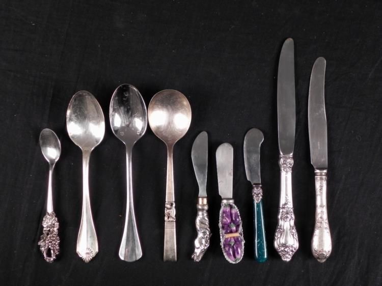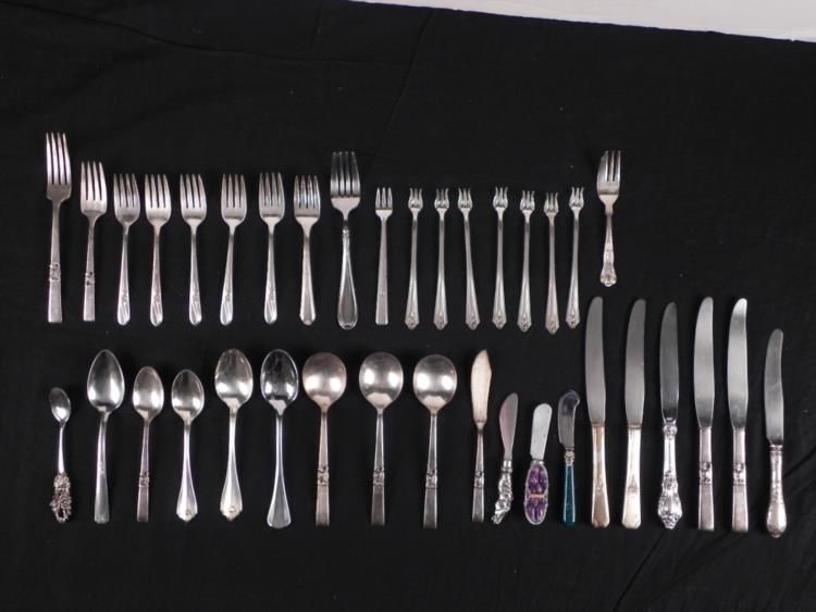 This is a 37 piece miscellaneous group of Silverplate Flatware. The patterns include a variety, mostly floral, and one unusual horse head knife. The untensils include knives, butter knives, forks, a group of matching pickle forks, and spoons. The names include Community Plate, Overall the pieces are in good previously used condition. This is a nice group to match to collections, or enjoy individually.