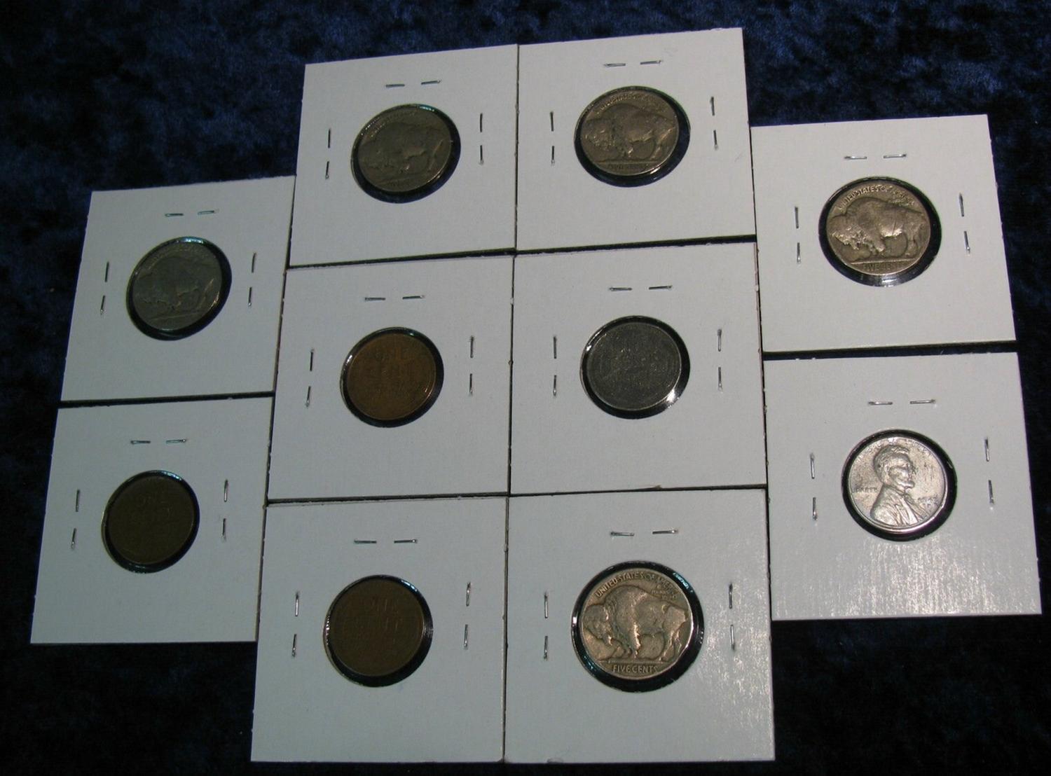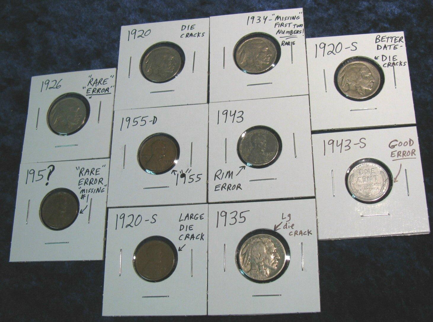 370. Group of 10 Lincoln Cents & Buffalo Nickels with Mint errors. Laminated planchet and etc.
