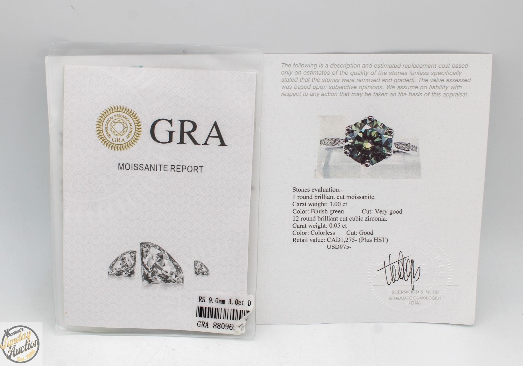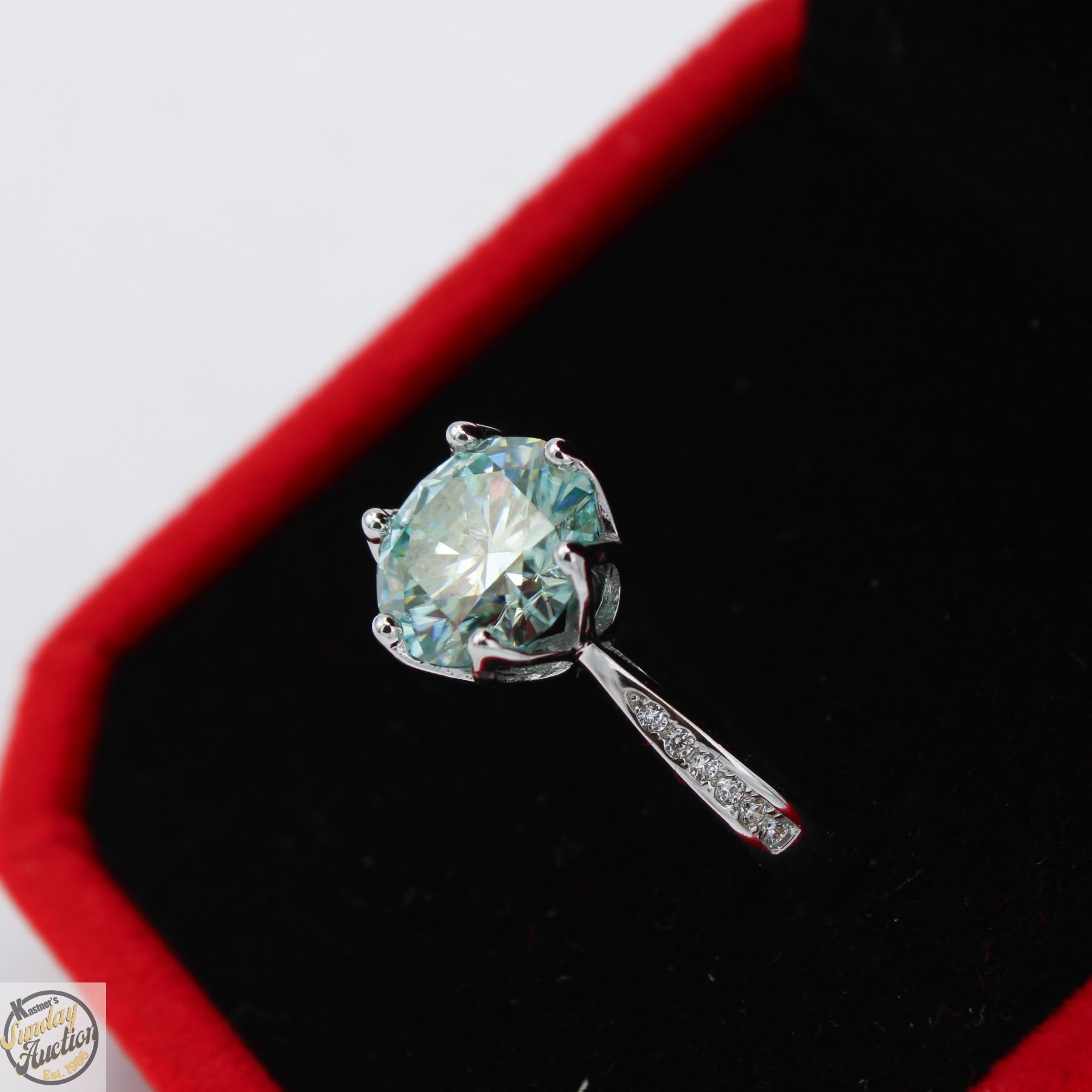 CUT MOISSANITE STONE VVS BLUISH GREEN COLOR WITH 12 ROUND BRILLIANT CUT CUBIC ZIRCONIA SET IN SHANKS SET IN 925 SILVER RING SIZE 7.25 RETAIL VALUE $1,275.00 **ALL ITEMS MUST BE REMOVED BY 5PM SATURDAY, FEBRUARY 7TH 2025. ALL REMAINING ITEMS WILL BE SUBJECT TO A $6.00 PER DAY STORAGE CHARGE. ANY ITEMS REMAINING AFTER MONDAY, FEBRUARY 23RD 2025 WILL BE CONSIDERED FORFEITED. NO REFUNDS WILL BE ISSUED FOR FORFEITED ITEMS. TO SCHEDULE A PICK UP APPOINTMENT CLICK HERE