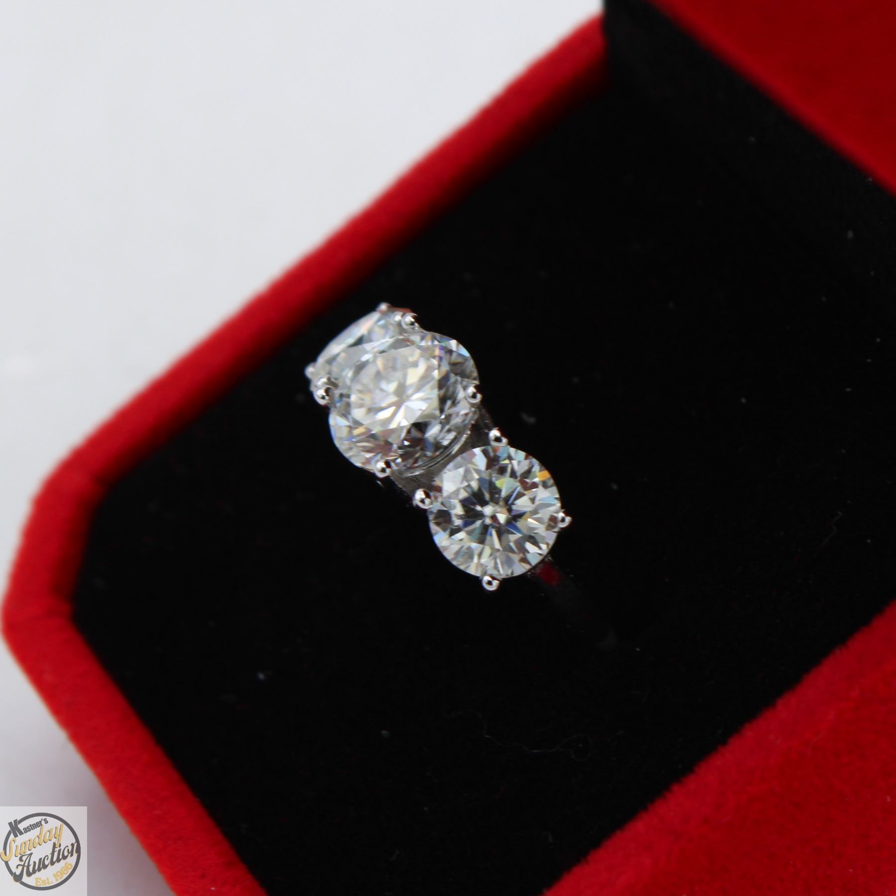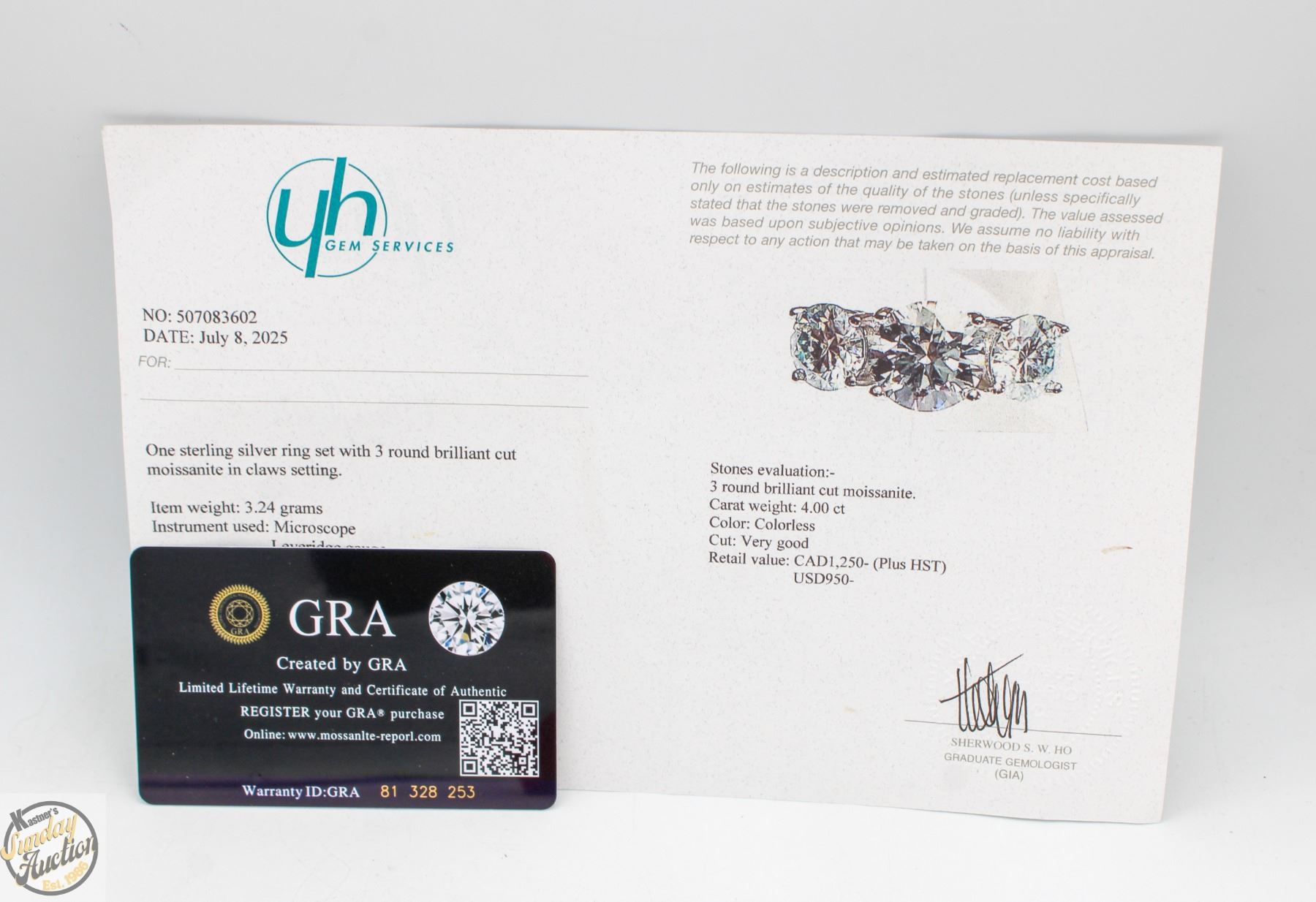 BRILLIANT CUT MOISSANITE STONES VVS D COLOR WITH 2.00 CT SET IN CENTER WITH 1.00 SET ON EITHER SIDE SET IN 925 SILVER RING SIZE 7.25 **ALL ITEMS MUST BE REMOVED BY 5PM SATURDAY, FEBRUARY 7TH 2025. ALL REMAINING ITEMS WILL BE SUBJECT TO A $6.00 PER DAY STORAGE CHARGE. ANY ITEMS REMAINING AFTER MONDAY, FEBRUARY 23RD 2025 WILL BE CONSIDERED FORFEITED. NO REFUNDS WILL BE ISSUED FOR FORFEITED ITEMS. TO SCHEDULE A PICK UP APPOINTMENT CLICK HERE