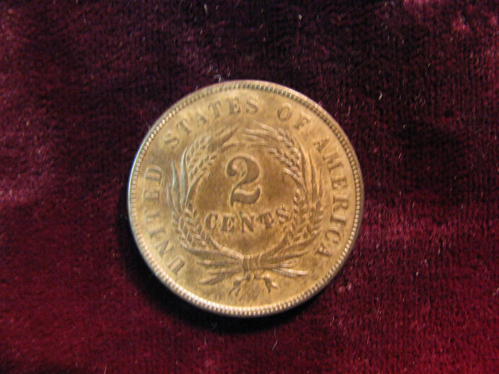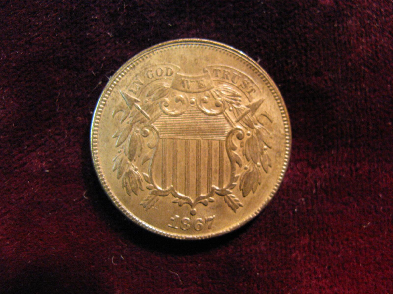 3709. 1867 2-Cent Piece. Brown AU.