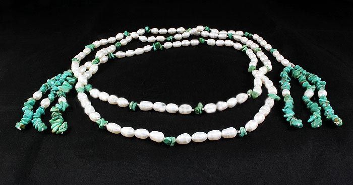 371.43CTW 55in. FASHION SCARF PEARL & TURQUOISE NECKLAC **|**|** 371.43CTW 55in. FASHION SCARF RICE PEARL & GREEN TURQUOISE NECKLACE; PEARL SIZE: 6.5X7.7MM ; MSRP: $600