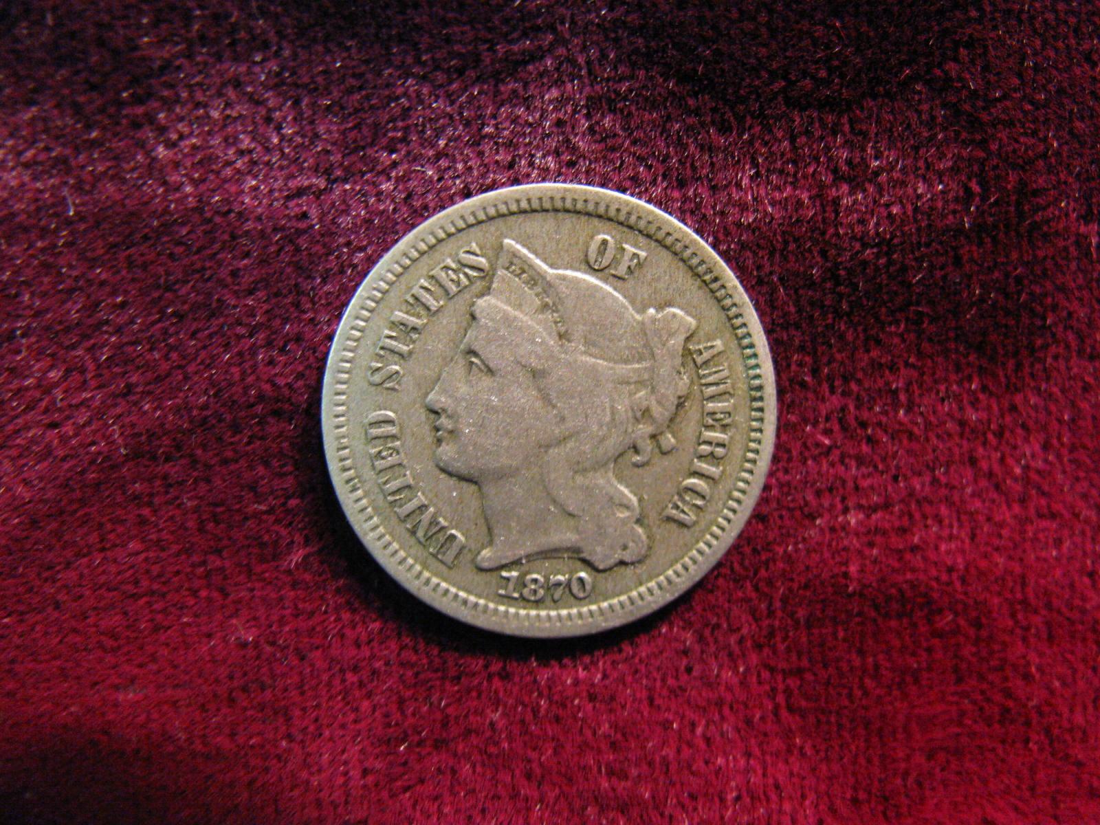 3713. 1870 3-Cent Nickel. VG.