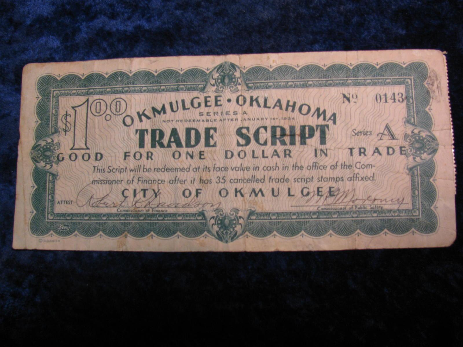 372. 1933 Okmulgee, Ok. $1 Depression Trade Script, With 35 Stamps Affixed.