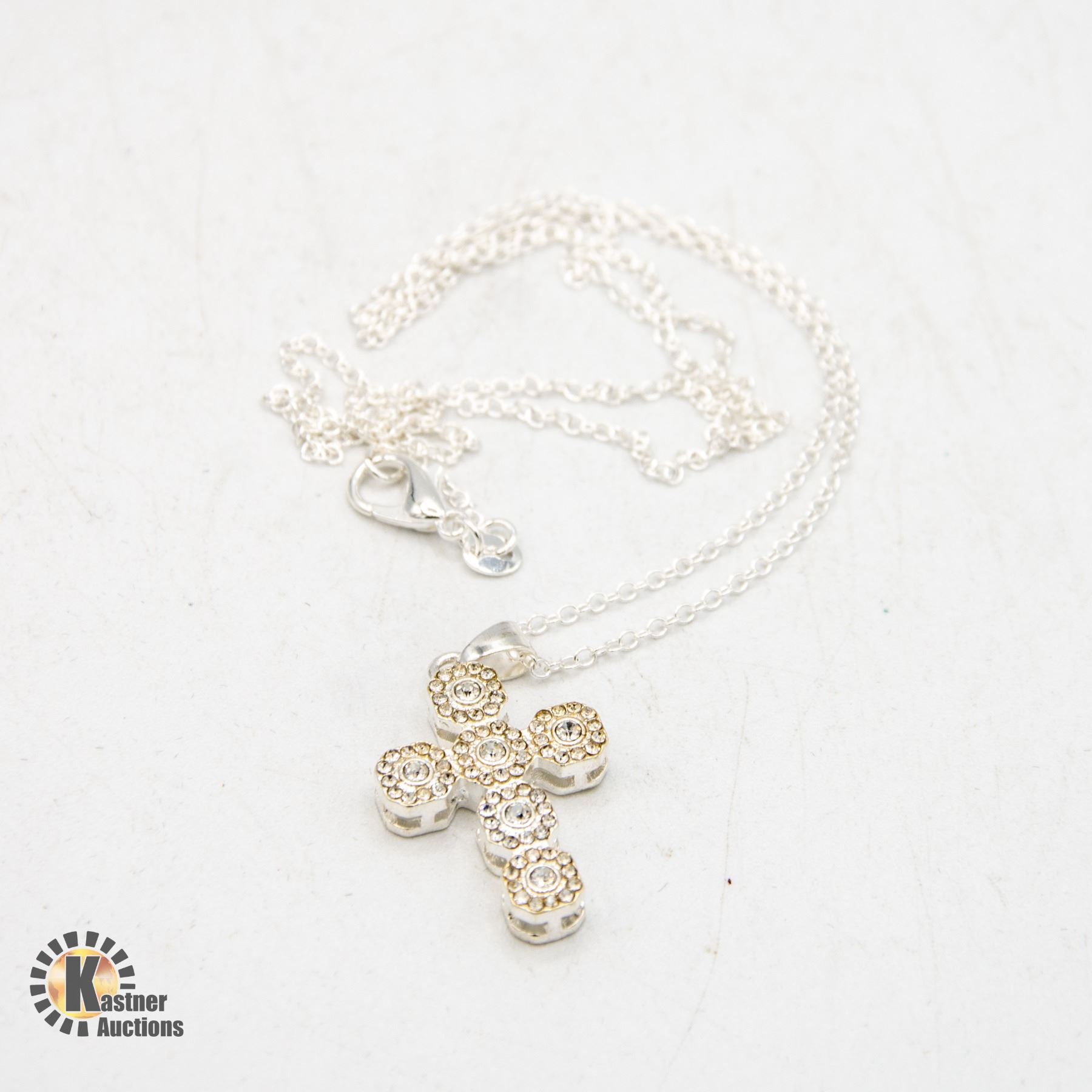 CROSS WITH 6 SECTIONS WITH CLEAR CENTERS WITH HALO STONES SET AROUND THE CENTERS