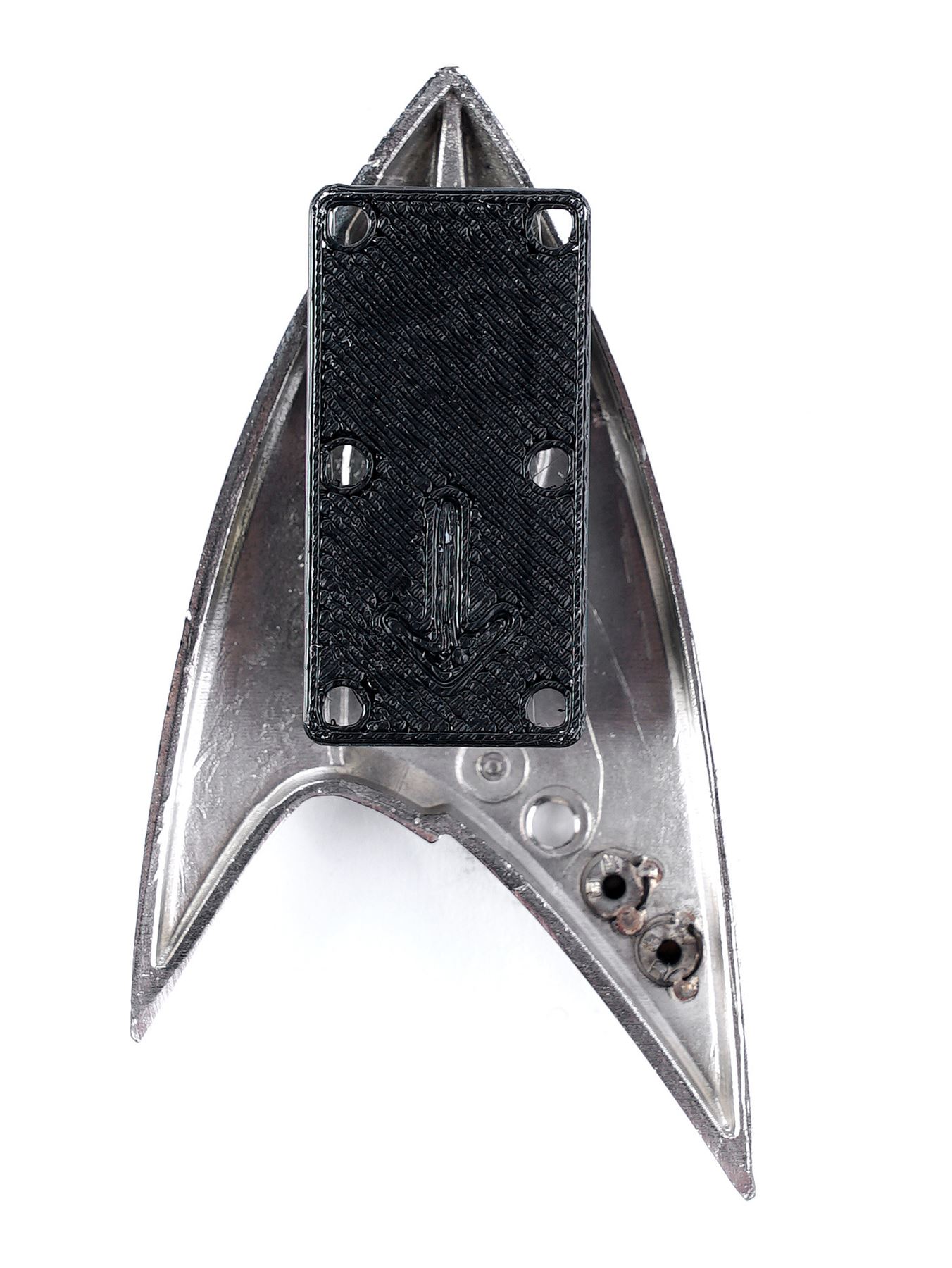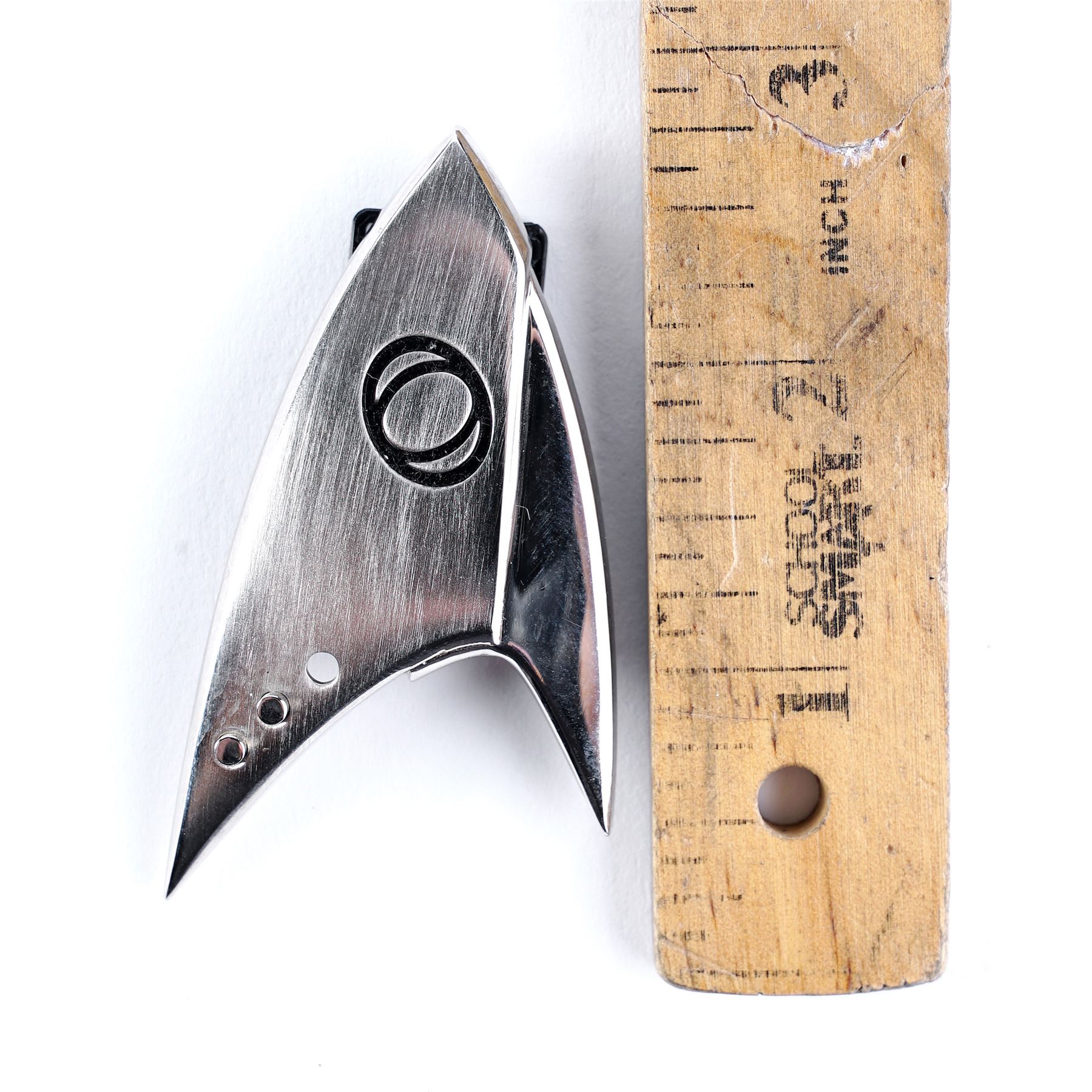 STAR TREK: DISCOVERY (2017-2024) - Starfleet Lieutenant Commander-Rank Science Badge - A Starfleet lieutenant commander-rank science badge from the television series Star Trek: Discovery. Throughout Seasons 1 through 3, Starfleet lieutenant commanders in the science division, such as Airiam and Paul Stamets, wore their badges while they served aboard the USS Discovery, the Shenzhou, and other spacecraft.