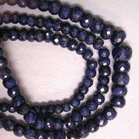 GRADUATED COLOR ENHANCED BLUE SAPPHIRE STRAND. IN WEIGHTS 374 CTS AND EACH BEAD MEASURES BETWEEN 5 AND 9 MM. INCLUSIONS VISIBLE. TEMPORARY METAL CLASP. LENGTH OF THE STRAND: 22 INCHES