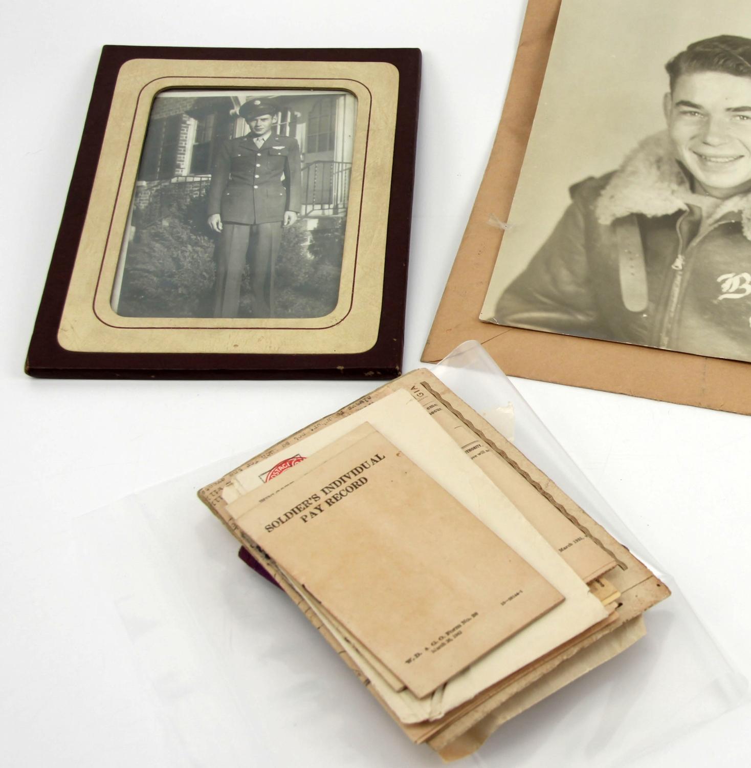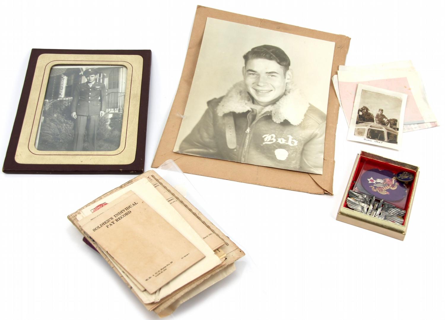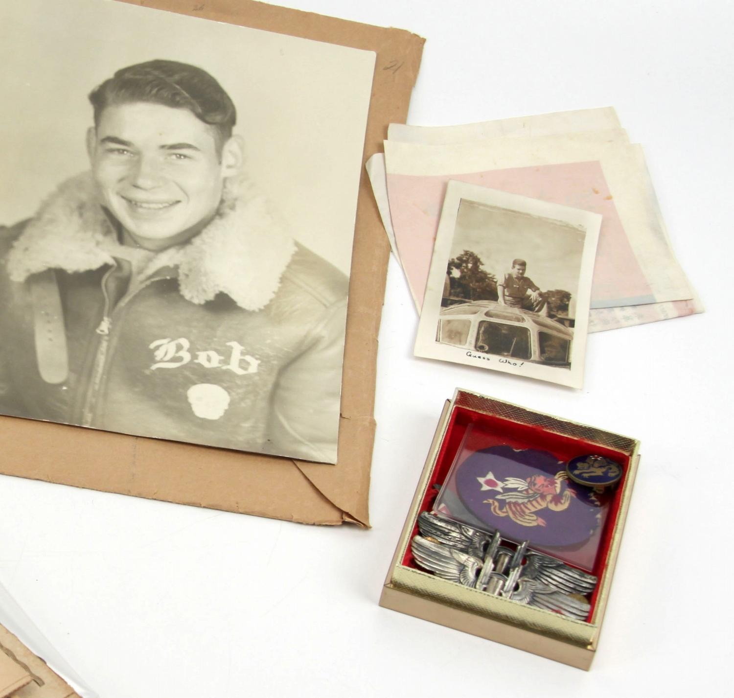 Grouping of items named to Robert L. Wescott, of the 374th Bombardment Squadron, 308th Bomb Operations, 14th Air Force, China, Burma, India Theater of Operations during WWII. Items include the following: A silk 14th Air Force in theatre-made patch (of a Flying Tiger), as well as a DUI. 2 sets of 3 inch sterling USAAF Gunners Wings, 1 set of 2 inch Gunners Wings, tie pin, small gold aviators wings, 2 bloot chits, numbered 3714 and 18749, picture of Robert Wescott in uniform (which shows one of the gunner wings in collection), soldiers pay record, a 374th Bombardment Squadron name listing book, point and talk translation book, A later photo taken of Wescott in Savannah, Ga, as well as nose art photos from the bomber he served on, "Night Mission", and 2 photos of him in bomber jacket.