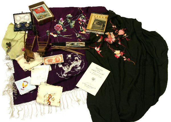 Grouping of CBI memorabilia, and items taken home as souvenirs, by Robert L. Wescott of 374th Bombardment Squadron, 14th Air Force in China, Burma, India Theater of Operations during WWII. Items include silk handkerchiefs and scarves from China, coin silver teacups, fashioned from Rupee coins by Jagat Narain & Sons Jewelers in India (1.9 OZT), 1936 Chinese Yuan, handcrafted miniature rickshaws, and more.