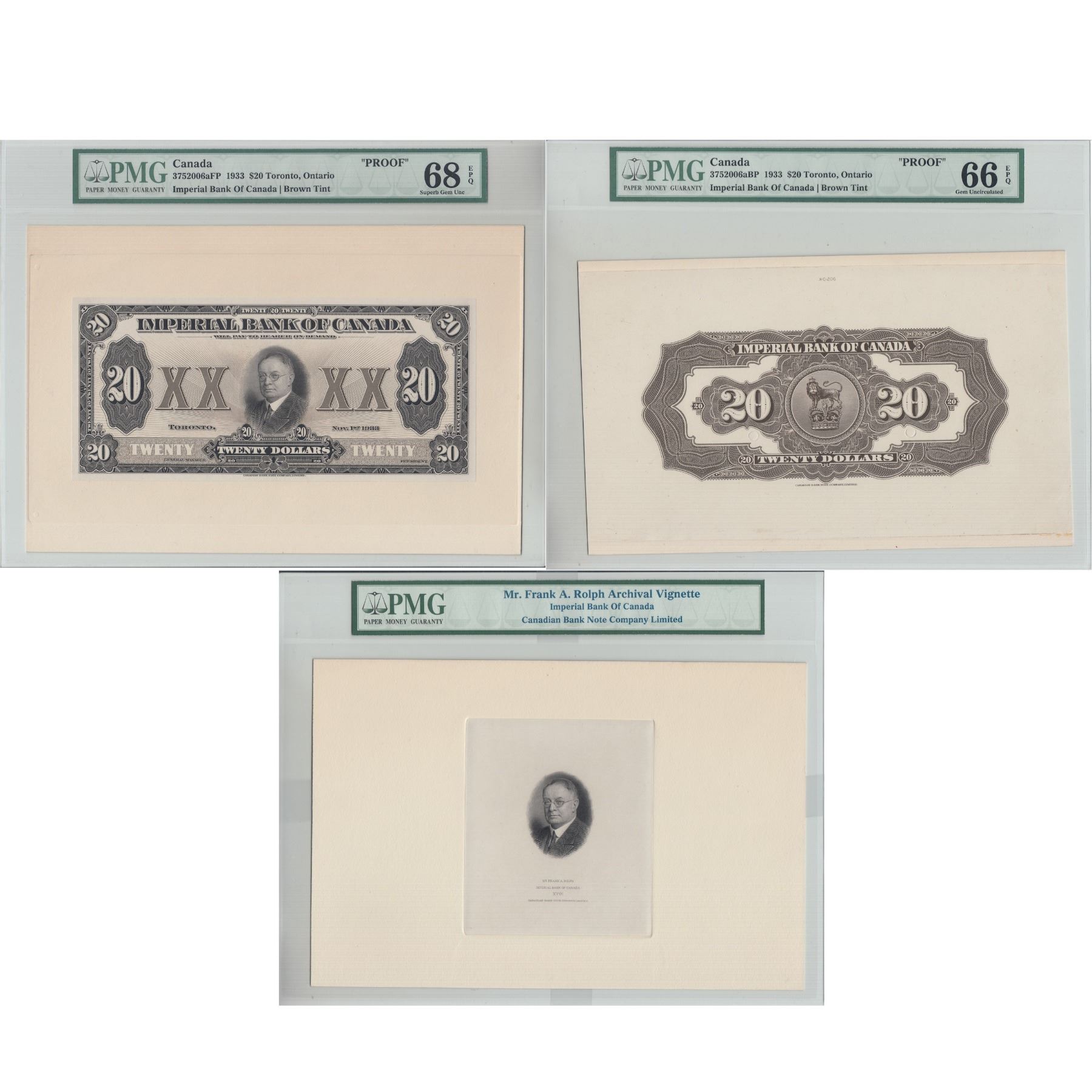 375-20-06aFP & BP (*Plus Bonus Vignette*) 1933 Imperial Bank of Canada 3 Piece Proof Banknote set with brown Tint. Face Proof is PMG Certified Superb Gem UNC-68 EPQ!! The Back Proof is GEM UNC-66 EPQ! And the Bonus Vignet of Mr. Frank A. Rolph is sealed in a PMG Holder as well. A great Collector Set with exception eye appeal! Worth a premium Bid!