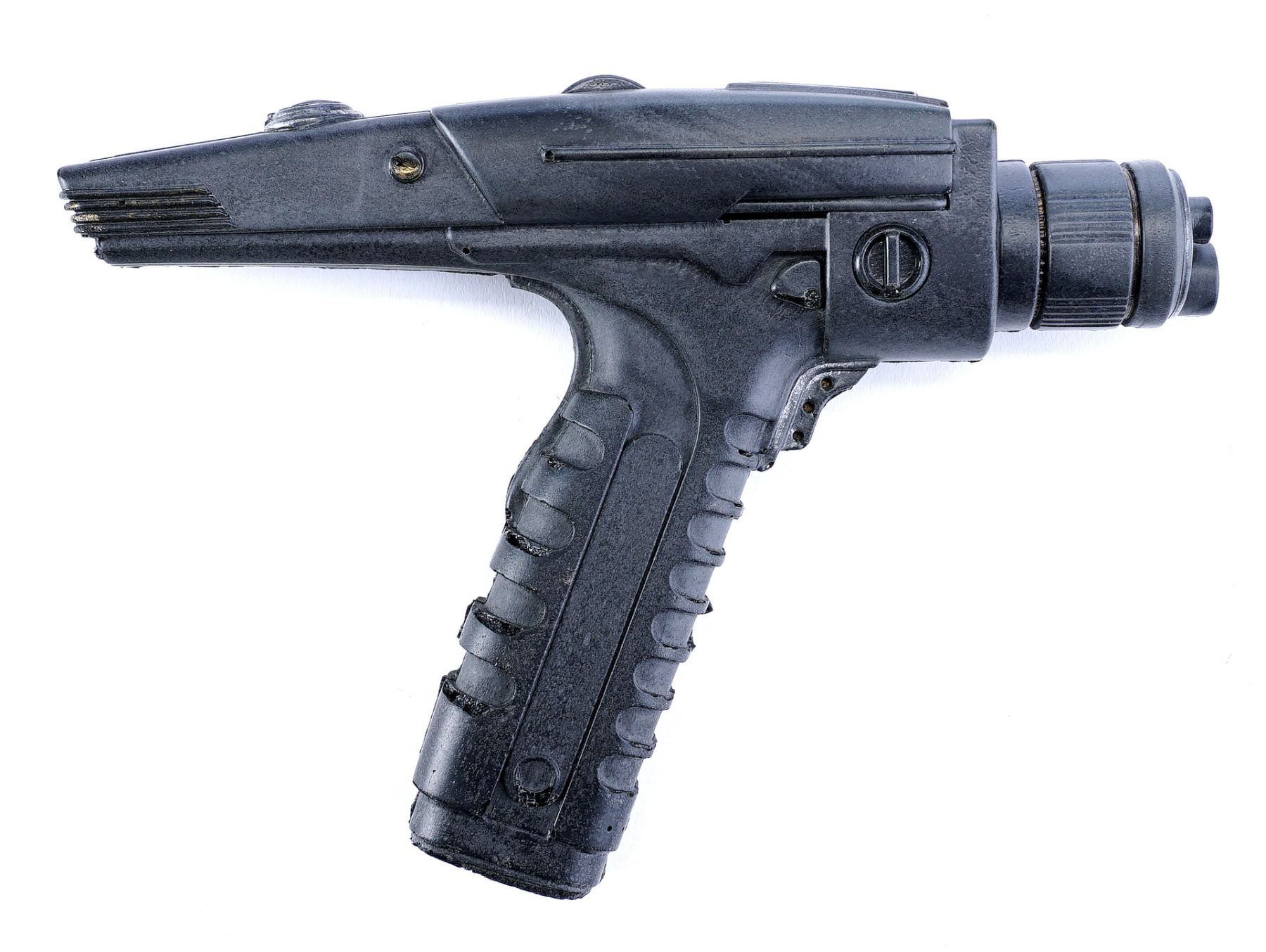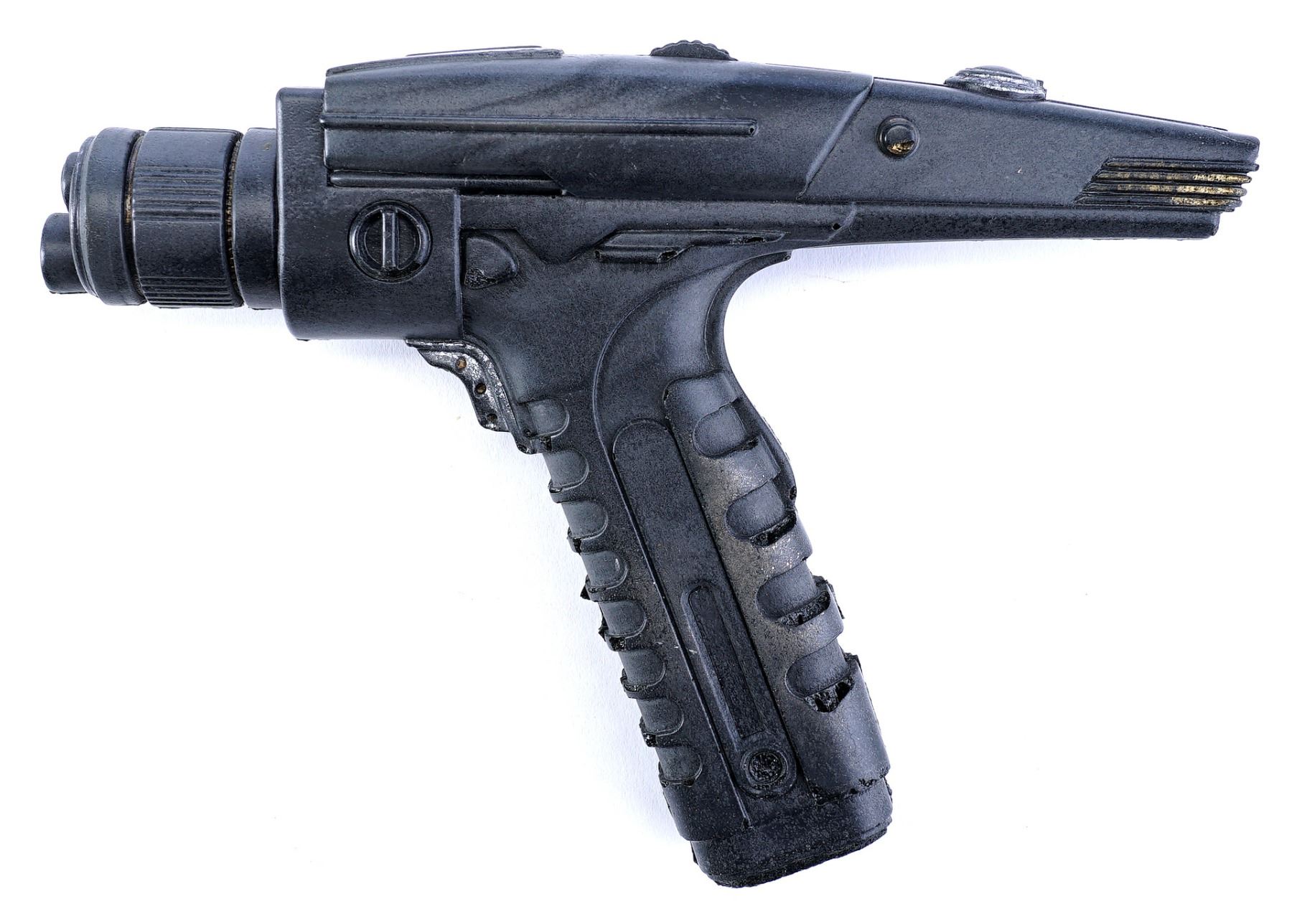 This lot consists of a blue cotton-spandex blend command-division jacket with gold-color striping, zippers, and embellishments; and a matching pair of blue and gold-color pants. Both are marked for the character. A pair of black leatherette operations-division boots with copper-color soles and delta attachments was added to complete the costume. Also included is a black foam Type II phaser with cast details including non-functional buttons and dials, a stationary trigger, a three-emitter front, and an embedded Type I phaser with a Starfleet delta on it. Remnants of gold and silver-color paint remain around elements such as the rear stripes and trigger. The costume exhibits some scuffing to the boots; and the phaser exhibits scuffing, tears in the foam, and bubbling in the finish. Dimensions: (phaser) 10" x 7" x 2.5" (25.5 cm x 18 cm x 6.5 cm)