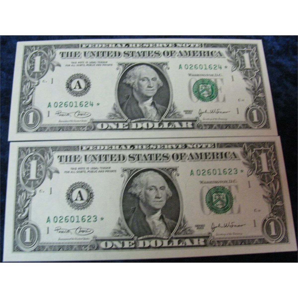 376. (2) Series 2003 Consecutive serial number $1 Federal Reserve Star Replacement Notes. CU.