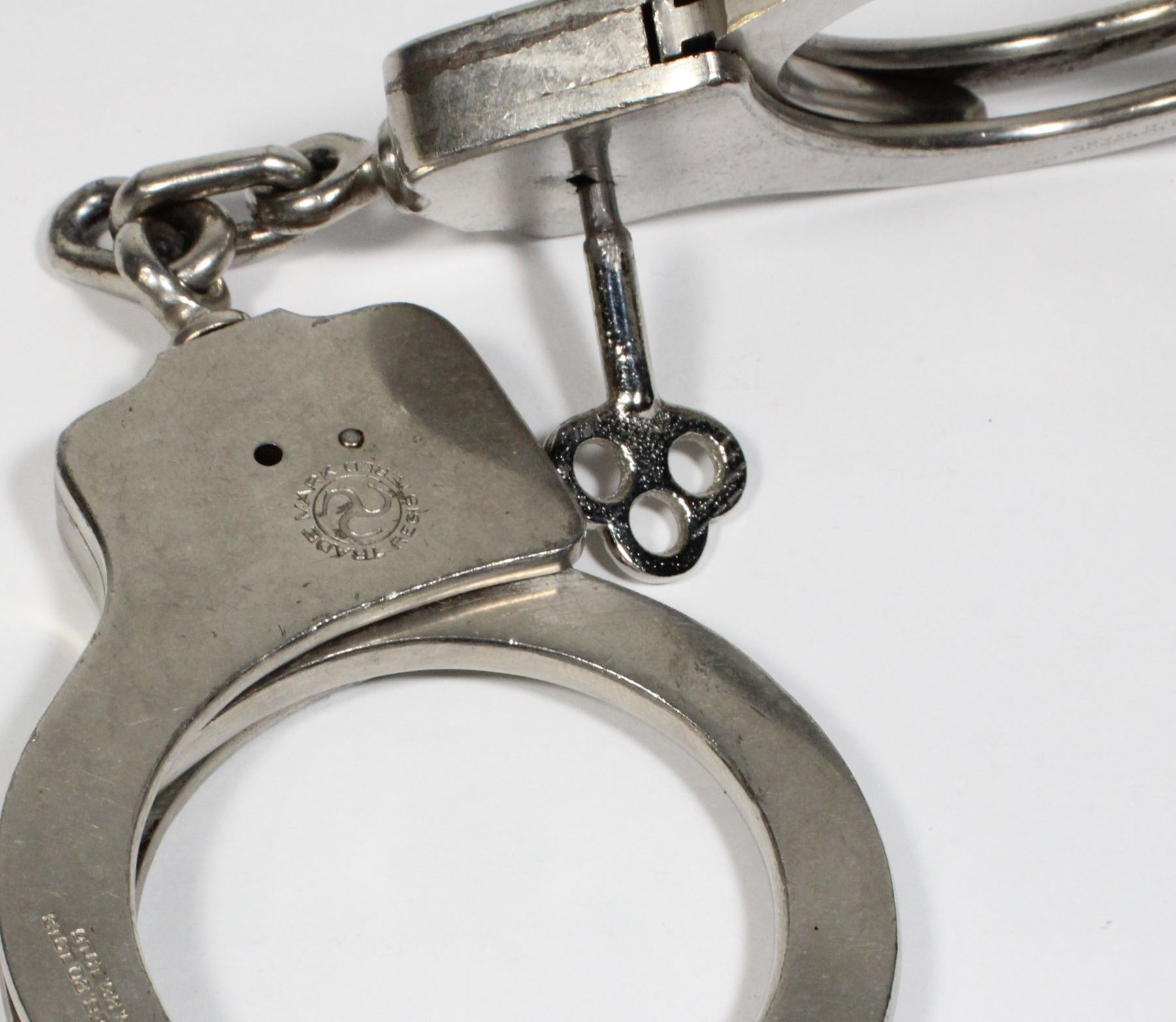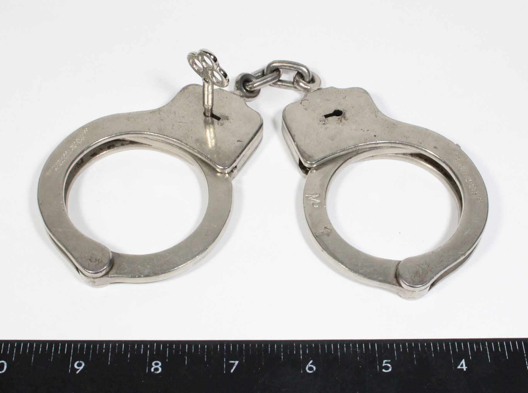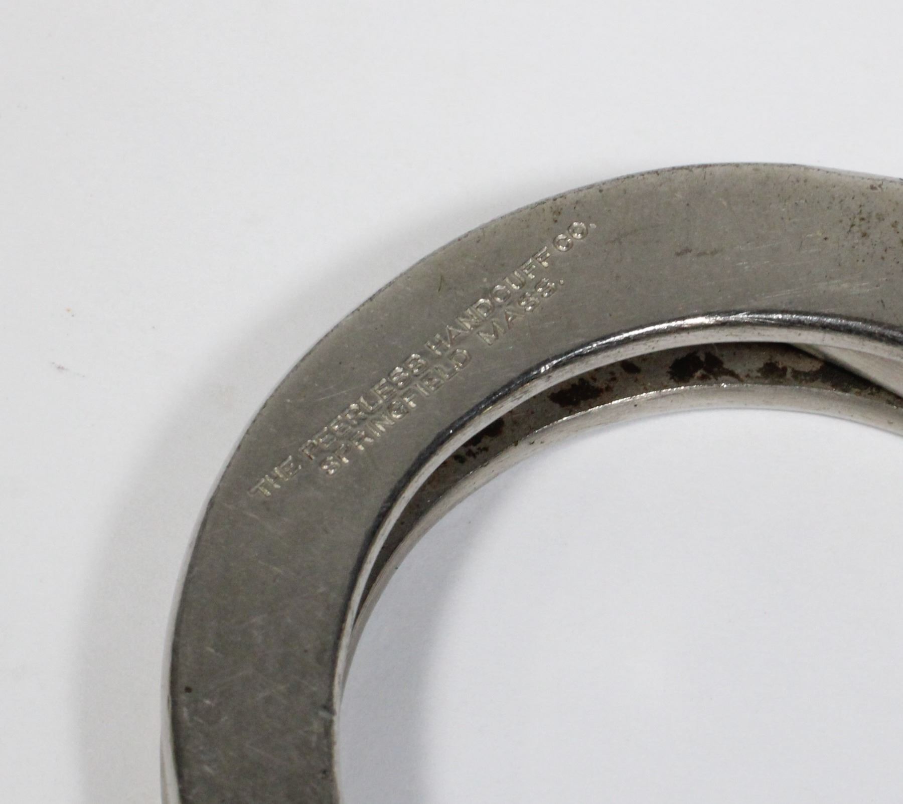 "MP 1" MARKED ON SIDE WORKING CONDITION WITH 1915 PATENT DATE, MARKED "PEERLESS HANDCUFF CO. SPRINGFIELD MASS." VINTAGE ROYAL CANADIAN MOUNTED POLICE RCMP LAW ENFORCEMENT