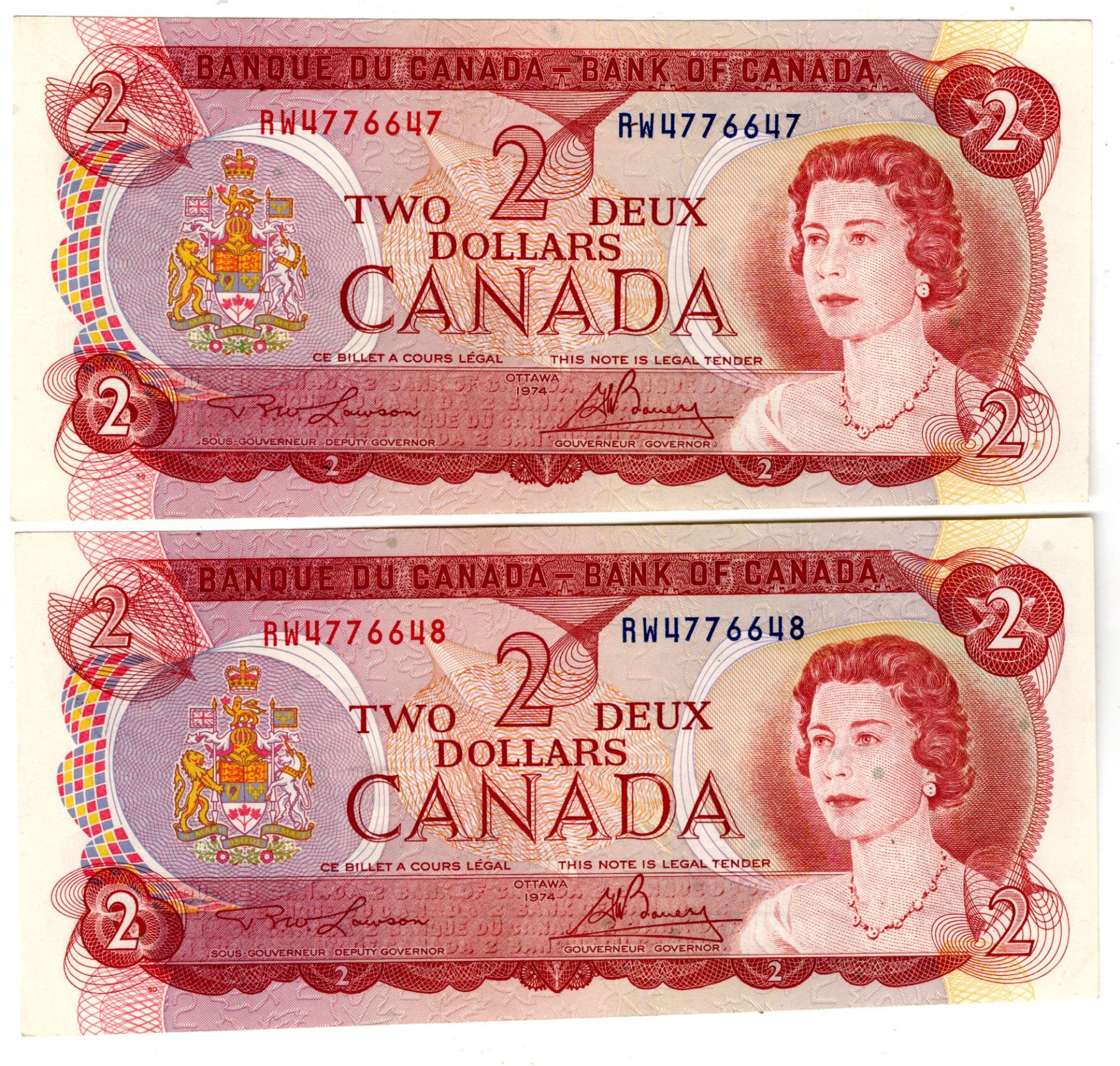 378. 2-1974 TWO DOLLAR BILLS, CONSECUTIVE SERIAL NUMBERS, UNCIRCULATED