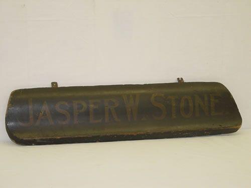 38 1/2" 19TH CENT. PAINTED TRADE SIGN-BLACK W/ YELLOW LETTERS "JASPER W. STONE" - IMPERFECTIONS & WEAR