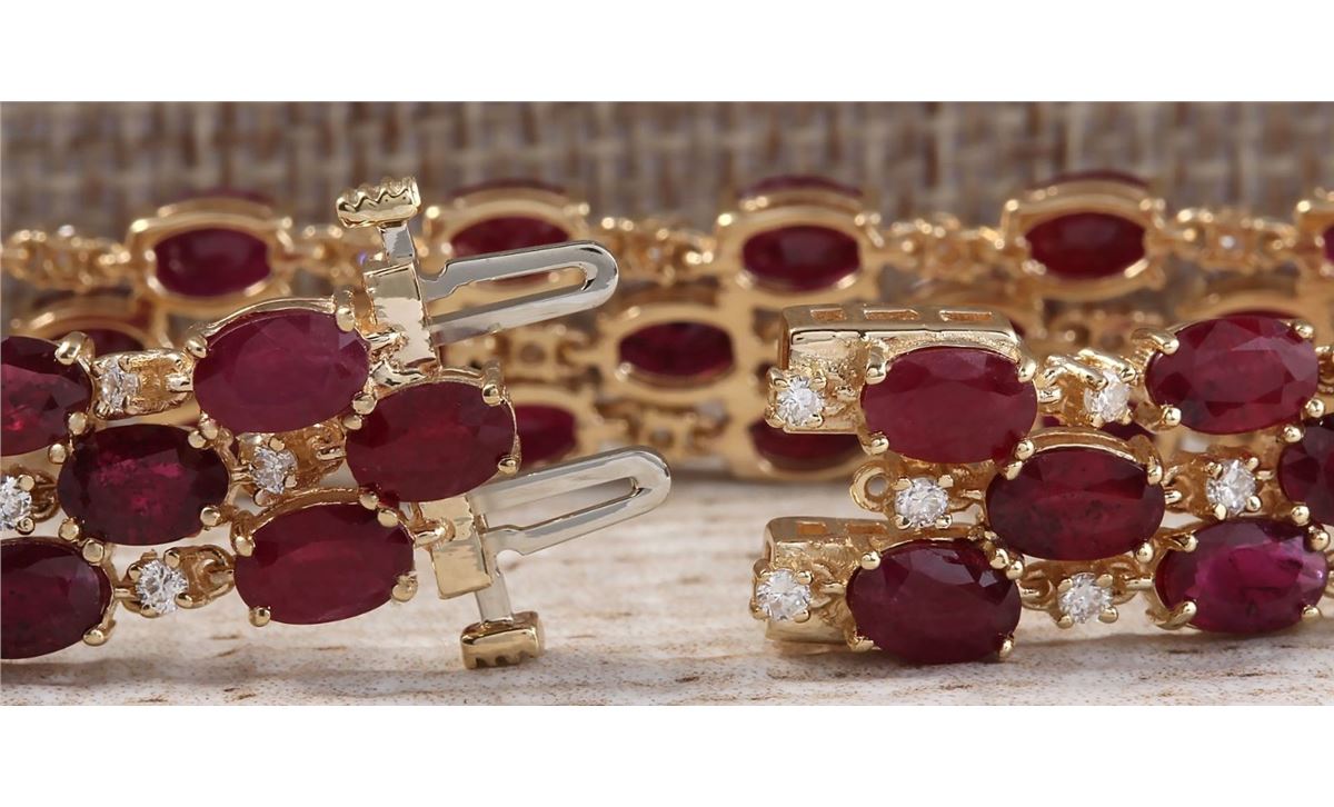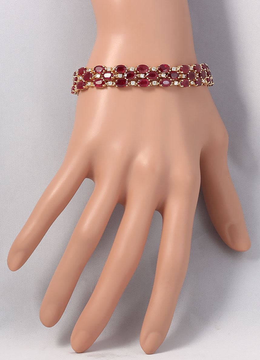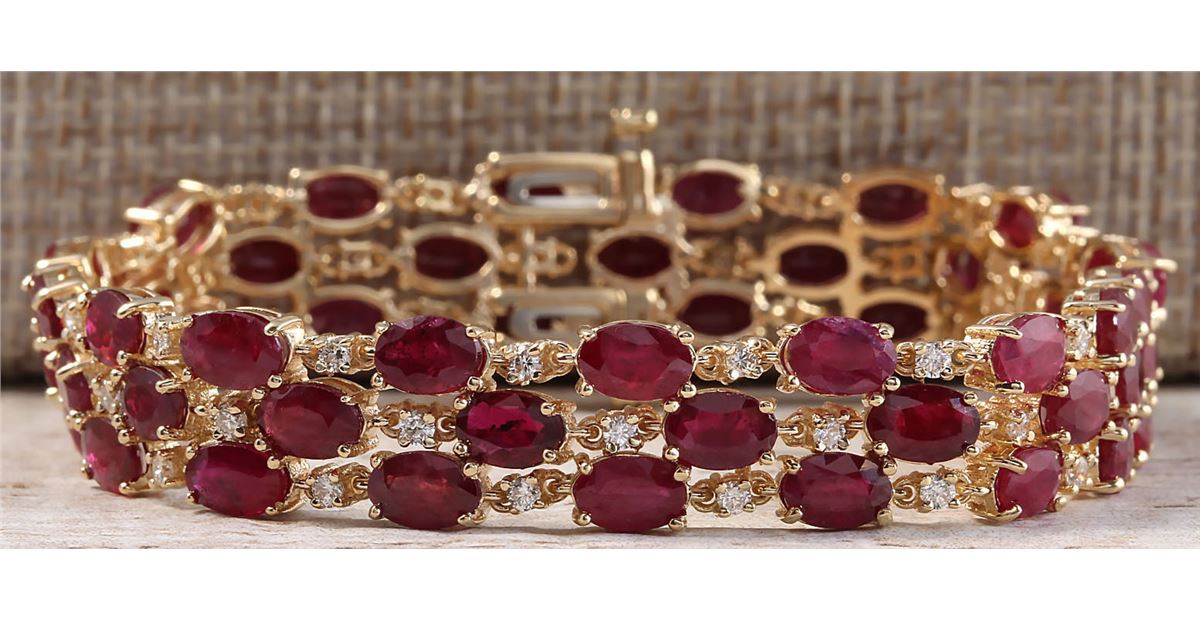 Stamped: 14K Bracelet Width: 11.03mm Bracelet Length: 7.30 Inches Total Bracelet Weight: 21 Grams Diamond Weight: Total natural diamond weight is 1.38carat. SI1-SI2 clarity / G-H color Gemstone Weight: Total natural (6x4) Ruby weight is 36.75carat. 100% Natural African Ruby Main stone color: Red [SKU:702778]