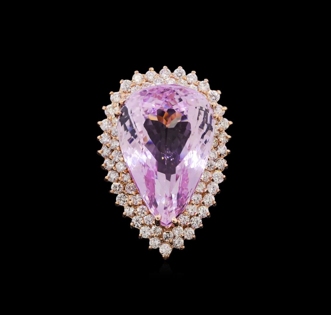 One electronically tested 14KT rose gold lady's cast fashion ring with a double basket halo with a bright polish finish. The featured lady's ring has a shank measuring 2.78 millimeters in width. Identified with markings of "14K". Condition is new, good workmanship. Containing: One prong set pear modified brilliant cut natural kunzite, measuring 25.60 x 17.60 x 12.30mm, (depth est.) approximate weight of 38.24ct., clarity is eye clean, light, moderately strong, purple red color, (GIA PR 3/4), cut is very good. Transmitting light with no distortion, transparent. Colored gemstones are presumed to have been subjected to commonly used enhancement processes. Graded in the setting. Thirty-Four prong set round brilliant cut diamonds, measuring 2.30 - 2.25 x 1.39mm (depth est.) approximate total weight of 34 Stones = 1.48ct. Graded in the setting. Clarity: SI-1 to SI-2. Color: H - I. Cut Good Thirty-Three prong set round brilliant cut diamonds, measuring 2.00 - 1.95 x 1.23mm (depth est.) approximate total weight of 33 Stones = 1.06ct. Graded in the setting. Clarity: SI-1 to SI-2. Color: H - I. Cut Good. Total Weight of Colored Stones 38.24ct. Total Weight of Diamonds 2.54ct. Total Weight of Ring 18.50gm. GAS Appraised at $17,215.00.
