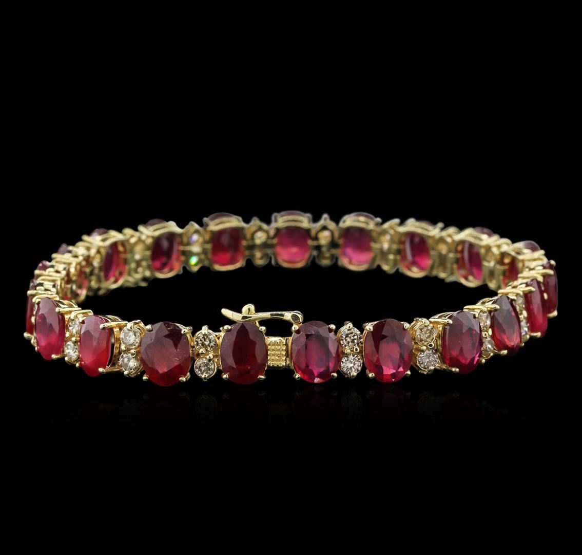 One electronically tested 14KT yellow gold ladies cast ruby and diamond bracelet with a hidden box clasp with a bright polish finish. 7.50" in length Identified with markings of "14K". Condition is new. Containing: Forty prong set oval modified brilliant cut natural rubies, measuring 7.00 x 5.00 x 3.25mm, approximate total weight of 38.40ct., clarity is heavily included, type II, medium dark, moderately strong, strongly purplish red color, (GIA stpR 6/4), cut is good. Twenty-One prong set round brilliant cut diamonds, measuring 2.50 - 2.50 x 1.50mm (depth est.) approximate total weight of 21 Stones = 1.20ct. Clarity: SI-1 to SI-2, Cut is Good. Colored gemstones are presumed to have been subjected to commonly used enhancement processes. All diamonds and colored gemstones are graded in the mounting, unless otherwise stated. Total Weight of Colored Stones 38.40ct. Total Weight of Diamonds 1.20ct. Total Weight of Bracelet 22.10 grams. GGL Appraised at $6,425.00.