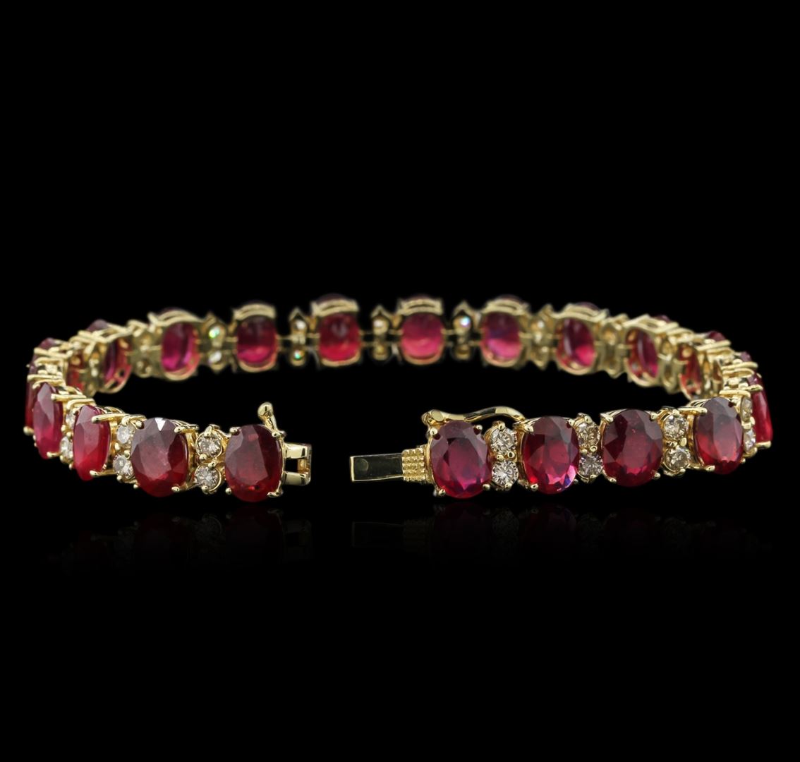 One electronically tested 14KT yellow gold ladies cast ruby and diamond bracelet with a hidden box clasp with a bright polish finish. 7.50" in length Identified with markings of "14K". Condition is new. Containing: Forty prong set oval modified brilliant cut natural rubies, measuring 7.00 x 5.00 x 3.25mm, approximate total weight of 38.40ct., clarity is heavily included, type II, medium dark, moderately strong, strongly purplish red color, (GIA stpR 6/4), cut is good. Twenty-One prong set round brilliant cut diamonds, measuring 2.50 - 2.50 x 1.50mm (depth est.) approximate total weight of 21 Stones = 1.20ct. Clarity: SI-1 to SI-2, Cut is Good. Colored gemstones are presumed to have been subjected to commonly used enhancement processes. All diamonds and colored gemstones are graded in the mounting, unless otherwise stated. Total Weight of Colored Stones 38.40ct. Total Weight of Diamonds 1.20ct. Total Weight of Bracelet 22.10 grams. GGL Appraised at $6,425.00.