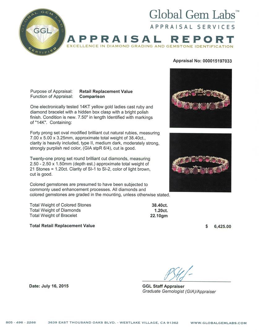 One electronically tested 14KT yellow gold ladies cast ruby and diamond bracelet with a hidden box clasp with a bright polish finish. 7.50" in length Identified with markings of "14K". Condition is new. Containing: Forty prong set oval modified brilliant cut natural rubies, measuring 7.00 x 5.00 x 3.25mm, approximate total weight of 38.40ct., clarity is heavily included, type II, medium dark, moderately strong, strongly purplish red color, (GIA stpR 6/4), cut is good. Twenty-One prong set round brilliant cut diamonds, measuring 2.50 - 2.50 x 1.50mm (depth est.) approximate total weight of 21 Stones = 1.20ct. Clarity: SI-1 to SI-2, Cut is Good. Colored gemstones are presumed to have been subjected to commonly used enhancement processes. All diamonds and colored gemstones are graded in the mounting, unless otherwise stated. Total Weight of Colored Stones 38.40ct. Total Weight of Diamonds 1.20ct. Total Weight of Bracelet 22.10 grams. GGL Appraised at $6,425.00.