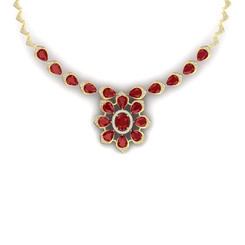 38.46 CTW Royalty Ruby & VS Diamond Necklace 18K Yellow Gold ---- Luxury Designer Brand Necklace Appraised Retail Price at $54,000 ---- SKU Number US39035 18K Yellow gold Necklace Size is 16 Inches, Can custom fit length, Necklace measuring approx. 4 3/4 x 1 1/2 Inches, weighing in total approx. 37 grams. Made in the USA and is stamped 18K, Main stone 3.37 carat total weight containing 1 pieces of Intense Mid-Opaque Red color with AAA quality Oval shape cut Ruby , Stone #2 32.4 carat total weight containing 18 pieces of Intense Mid-Opaque Red color with AAA quality Pear shape cut