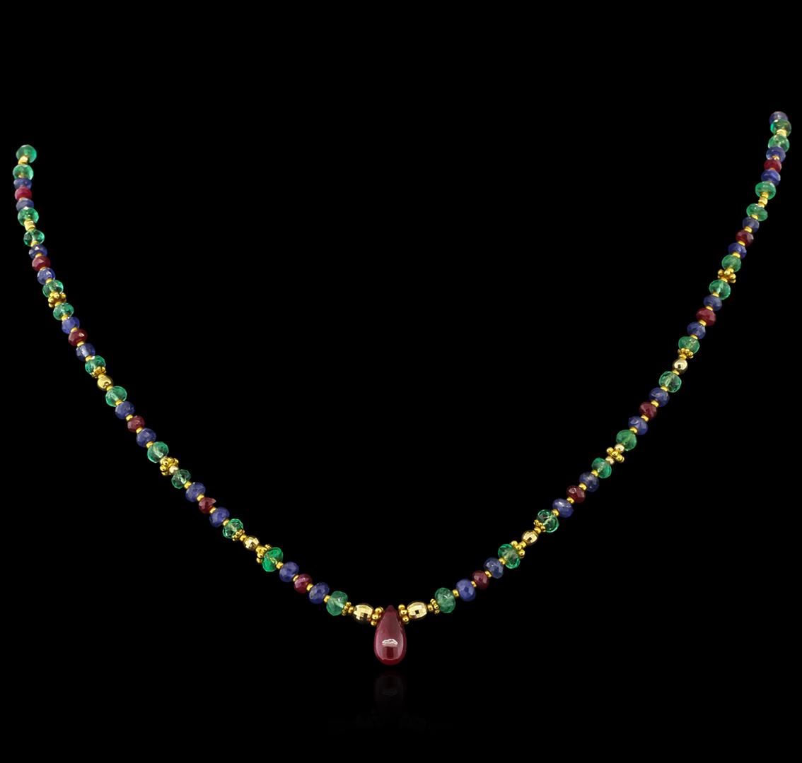 One necklace featuring: 14KT yellow gold weighing 10.13 grams containing one pear shape ruby center stone with a total weight of 3.00ct, round cut rubies with a total weight of 7.50ct, round cut emeralds with a total weight of 12.00ct and round cut blue sapphires with a total weight of 16.00ct.