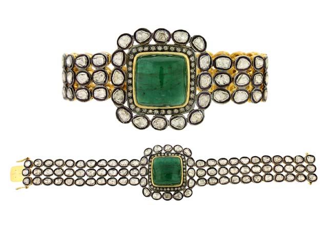 EMERALD AND ROSE CUT DIAMOND DESIGNER BRACELET/**/Diamond Count1:/Diamond 1 CTW:6.03/Diamond Color & Clarity:ROSE CUT J-L/I1-12/Diamond Count 2:/Diamond 2 CTW:/Diamond Color & Clarity:/Gemstone Count1:1/Gemstone 1 CTW:32.51/Gemstone Count 2:/Gemstone 2 CTW:/Metal Type 1 Gold:14K GOLD/Gold Gram Weight:11.12/Metal Type 2:over 0.925 Sterling Silver /Silver Gram Weight:27.39/Gross Weight:46.22