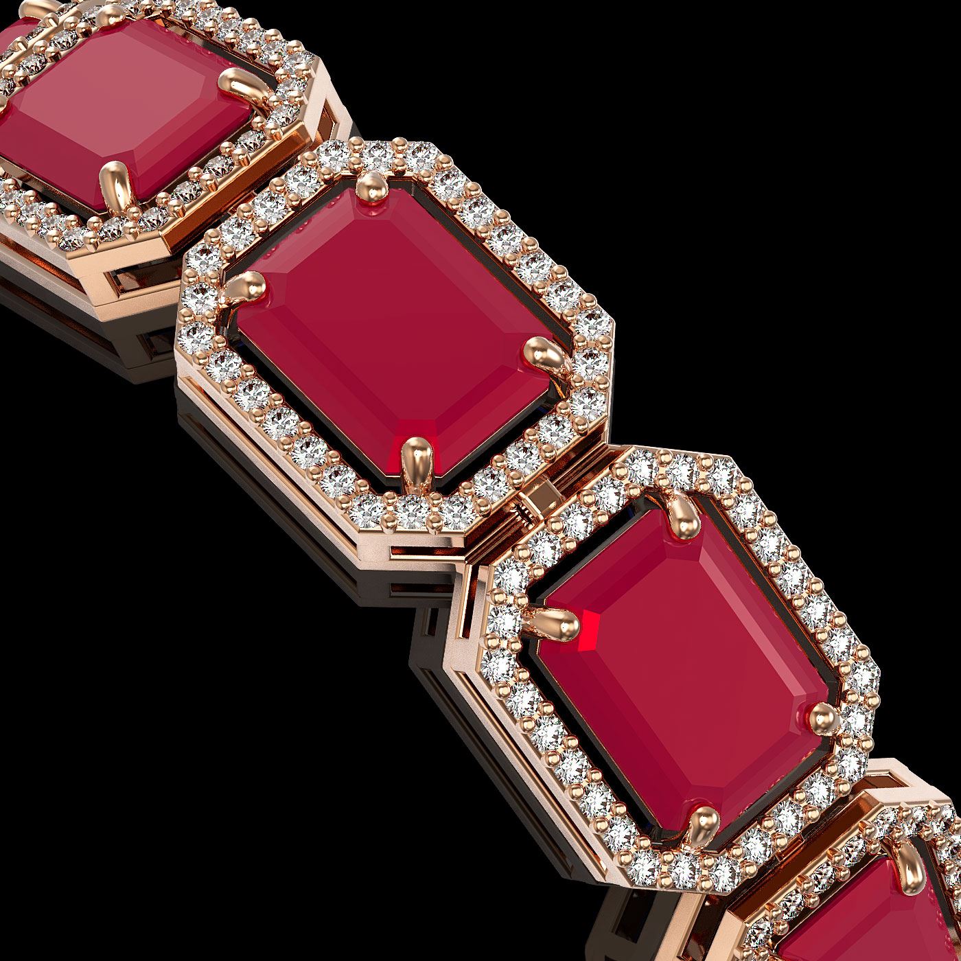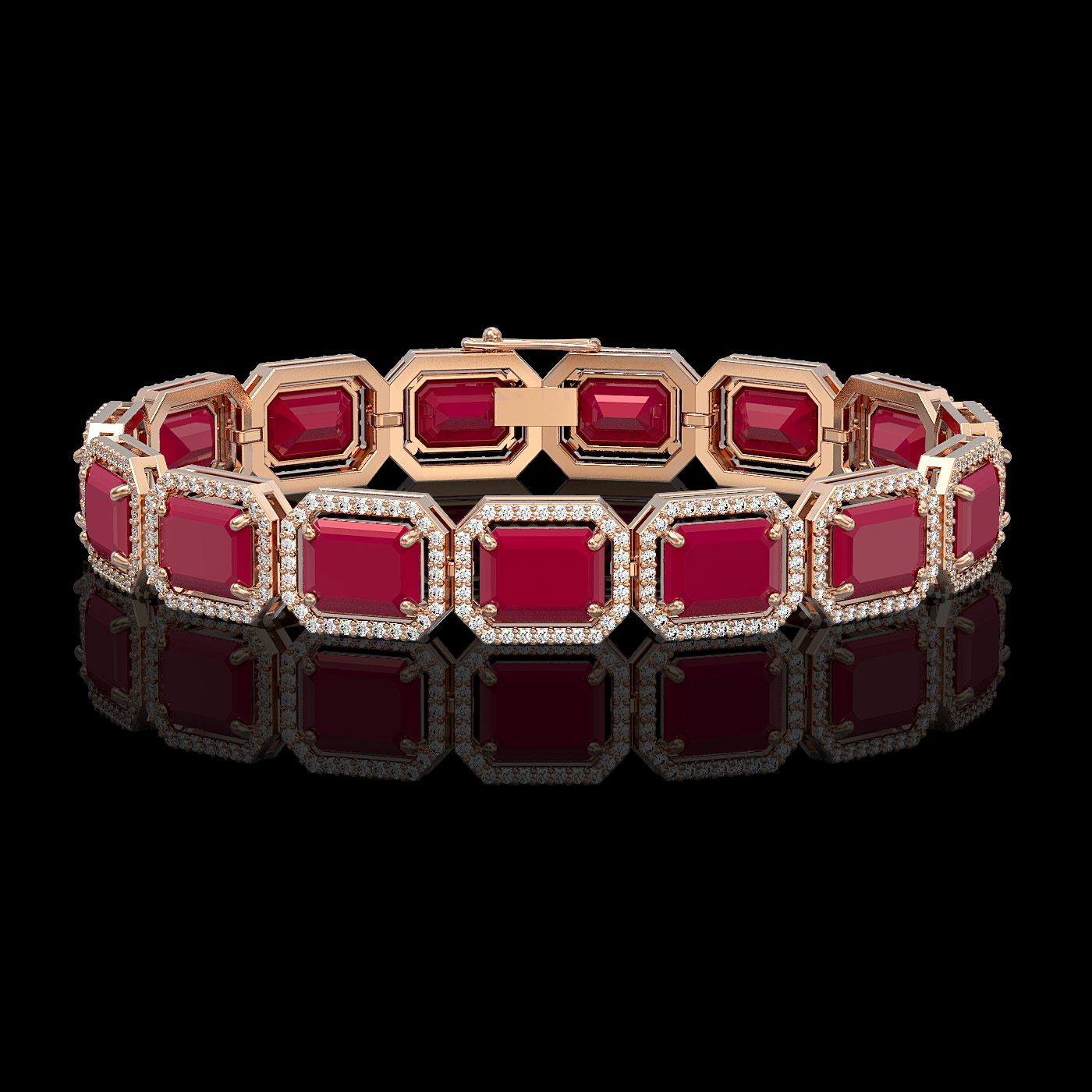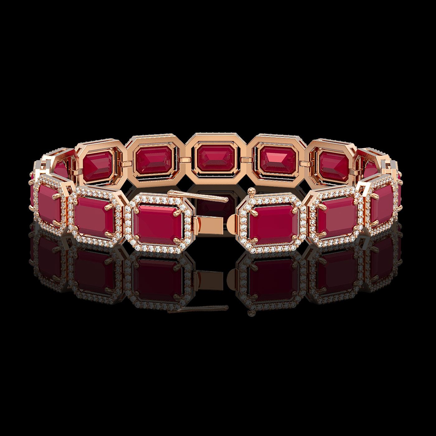 REF-424M5H -41526 ---- 38.61 CTW Ruby & Diamond Halo Bracelet 10K Rose Gold ---- Luxury Designer Brand Bracelet Appraised at $23,350 Certificate Number US41526 10k Rose gold, Bracelet Size is 7 Inches, Bracelet measuring approx. 10 mm x 7 Inches, weighing in total approx. 16 grams. Made in the USA and is stamped 10k, Main stone 35.25 carat total weight containing 15 pieces of Mid-Opaque-Deep Red color with AAA quality Emerald Cut shape cut Ruby , Stone #2 3.36 carat total weight containing 420 pieces of G-H color with VS/SI quality Round shape cut Diamond