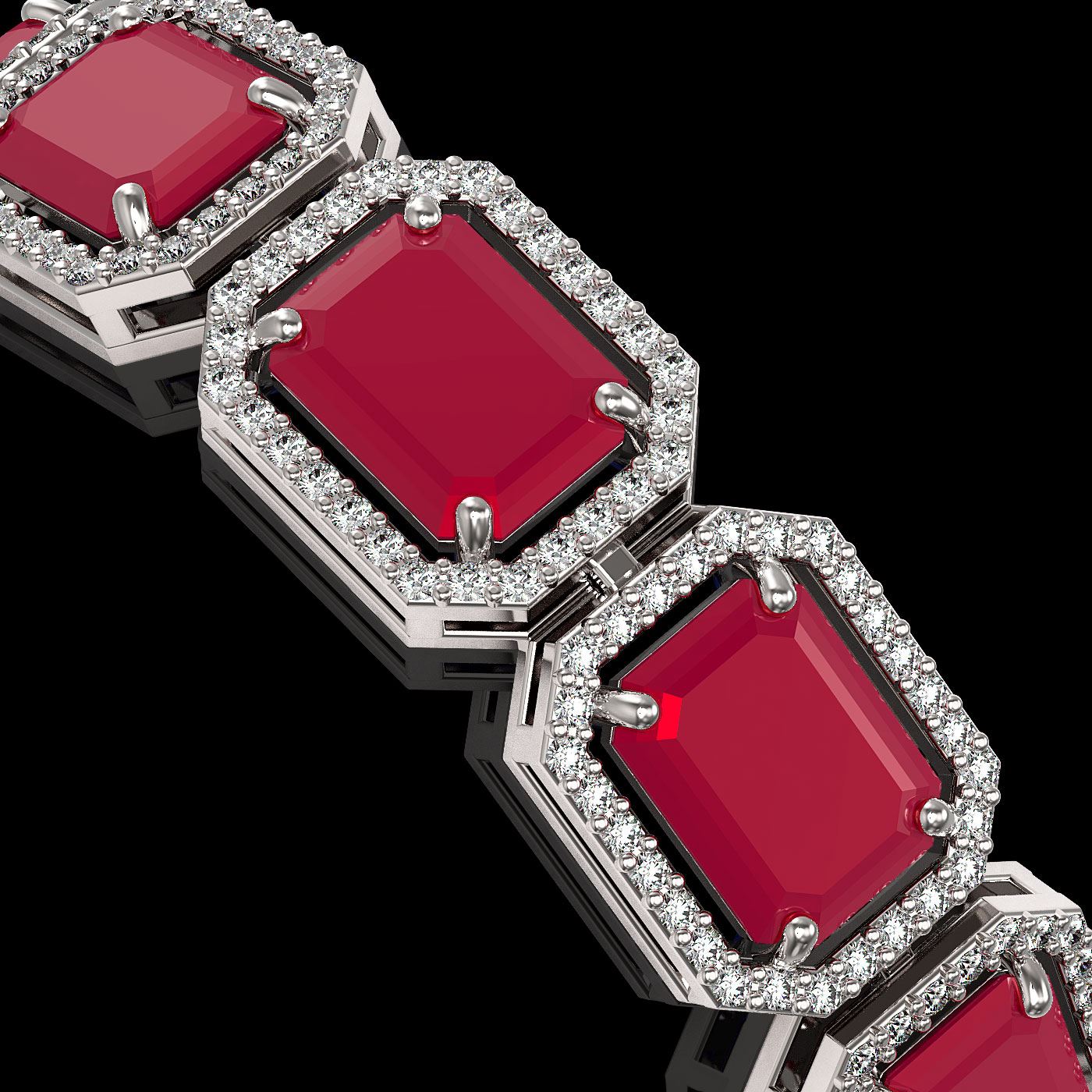 REF-424X5T -41525 ---- 38.61 CTW Ruby & Diamond Halo Bracelet 10K White Gold ---- Luxury Designer Brand Bracelet Appraised at $23,350 Certificate Number US41525 10k White gold, Bracelet Size is 7 Inches, Bracelet measuring approx. 10 mm x 7 Inches, weighing in total approx. 16 grams. Made in the USA and is stamped 10k, Main stone 35.25 carat total weight containing 15 pieces of Mid-Opaque-Deep Red color with AAA quality Emerald Cut shape cut Ruby , Stone #2 3.36 carat total weight containing 420 pieces of G-H color with VS/SI quality Round shape cut Diamond