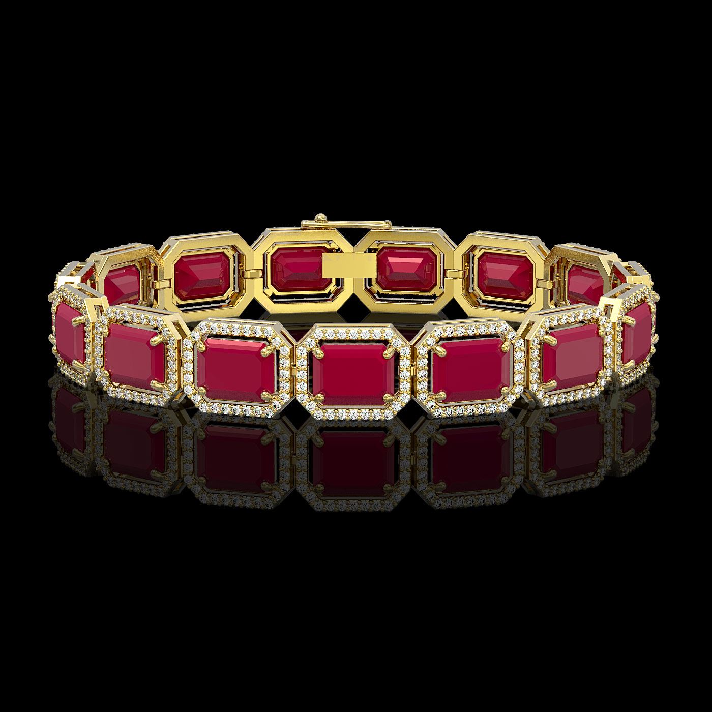 REF-424H5A -41527 ---- 38.61 CTW Ruby & Diamond Halo Bracelet 10K Yellow Gold ---- Luxury Designer Brand Bracelet Appraised at $23,350 Certificate Number US41527 10k Yellow gold, Bracelet Size is 7 Inches, Bracelet measuring approx. 10 mm x 7 Inches, weighing in total approx. 16 grams. Made in the USA and is stamped 10k, Main stone 35.25 carat total weight containing 15 pieces of Mid-Opaque-Deep Red color with AAA quality Emerald Cut shape cut Ruby , Stone #2 3.36 carat total weight containing 420 pieces of G-H color with VS/SI quality Round shape cut Diamond