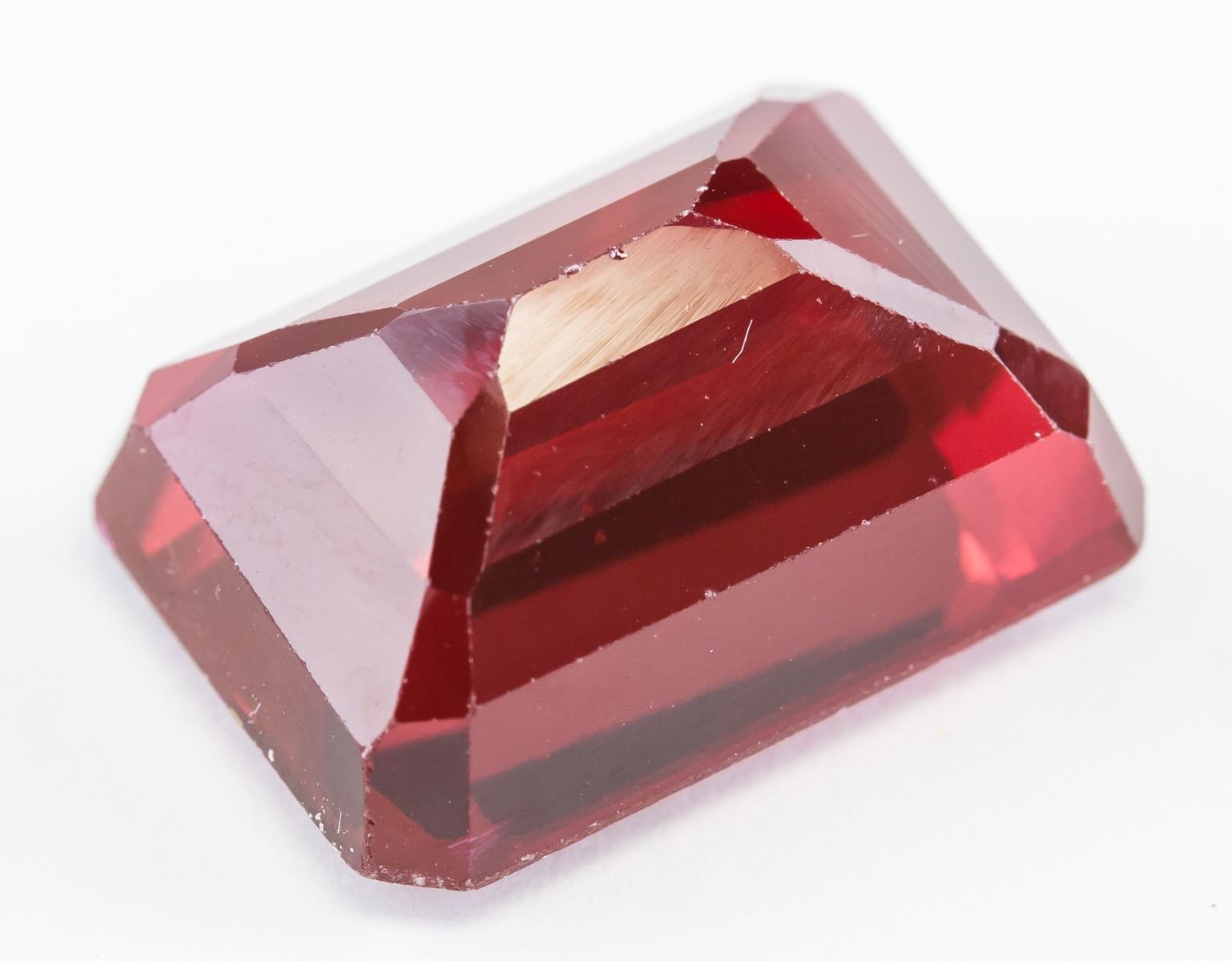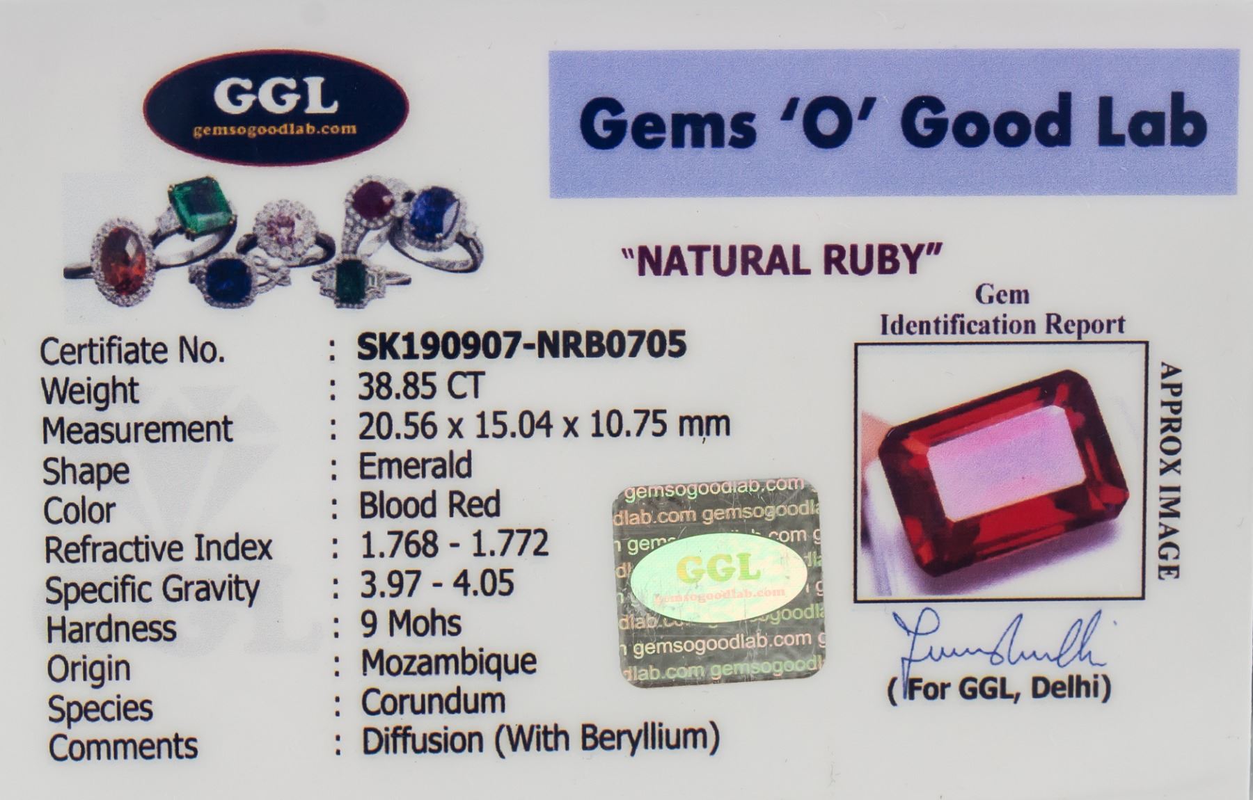 One (1) 38.85 ct emerald cut blood red ruby gemstone. 20.56 x 15.04 x 10.75 mm. Accompanied with GGL certificate.