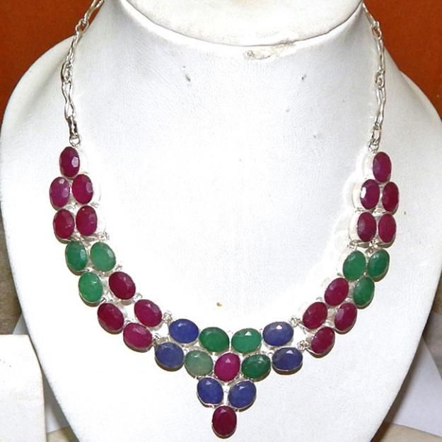 38.90g Necklace of Emerald,Ruby and Sapphire Sterling Silver