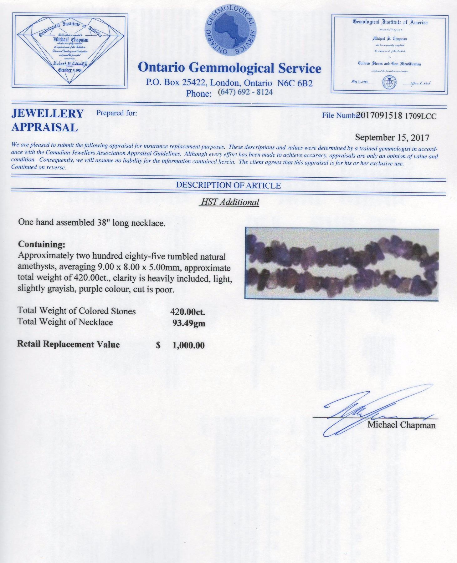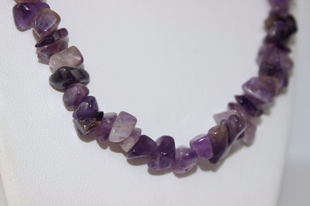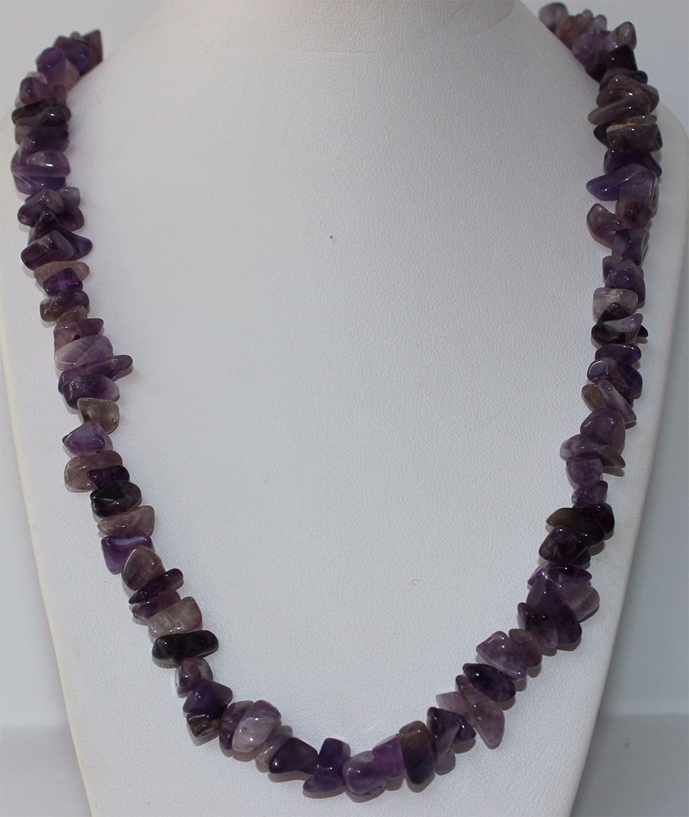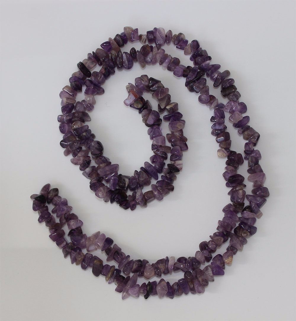 One hand assembled 38" long necklace. The necklace contains approximately two hundred eighy-five tumbled natural amethysts, averaging 9.00 x 8.00 x 5.00mm, approximate total weight of 420.00ct, clarity is heavily included, light, slightly grayinsh, purple colour, cut is poor. The total weight of the necklace is 93.49gm. Appraised at $1000.00CAD