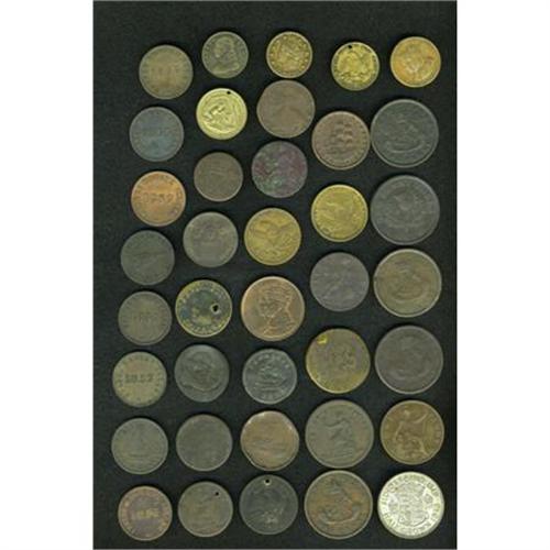 <B>38-Piece Assortment of Canadian, U.S., World Tokens.</B></I> Wide variety of early Canadian Breton tokens, U.S. Colonial and other tokens, plus world coins and tokens.<BR><BR><b>Shipping:</b> Coins & Currency (<a target="_blank" href="http://www.heritageauctions.com/common/shipping.php">view shipping information</a>)