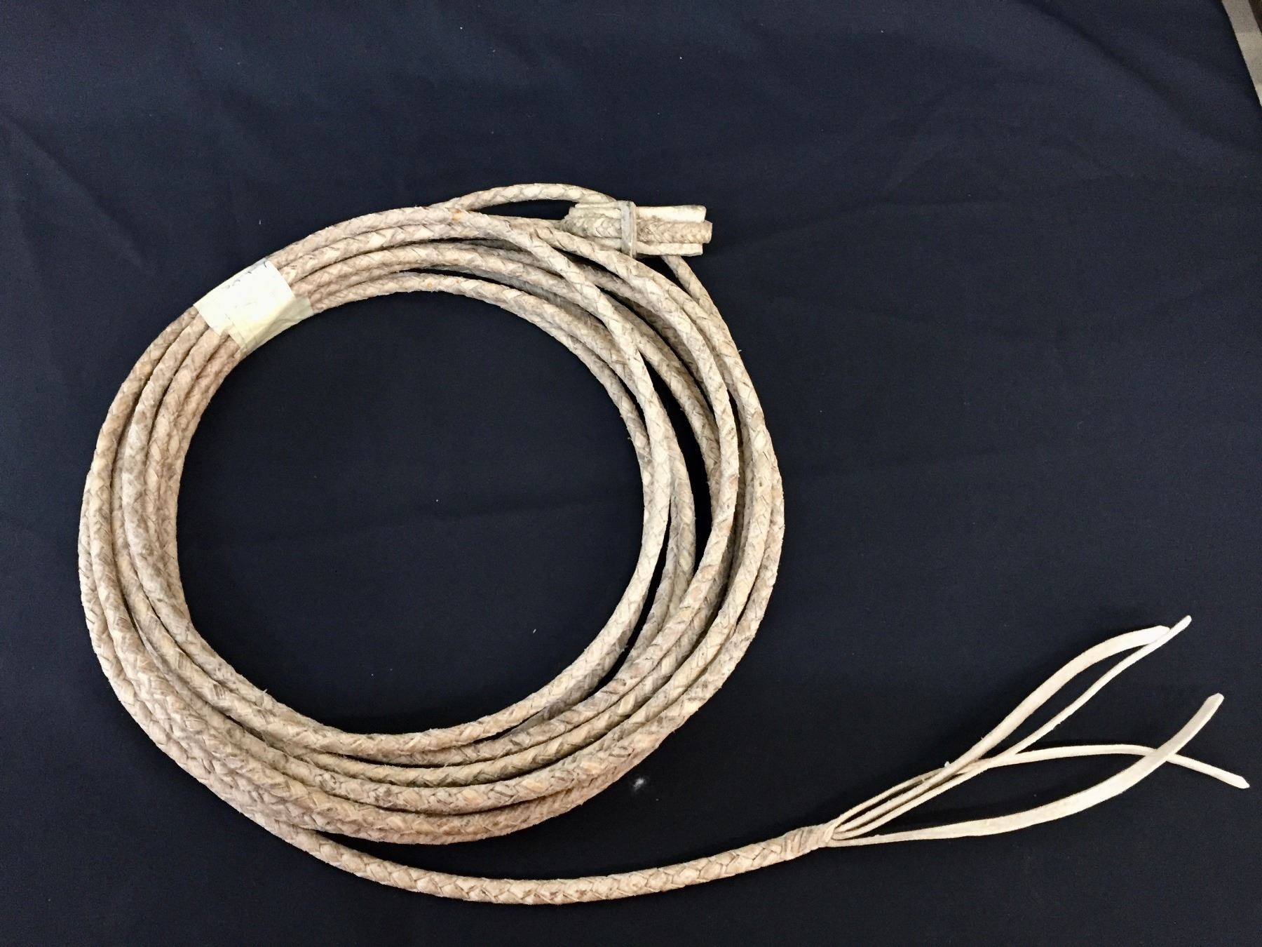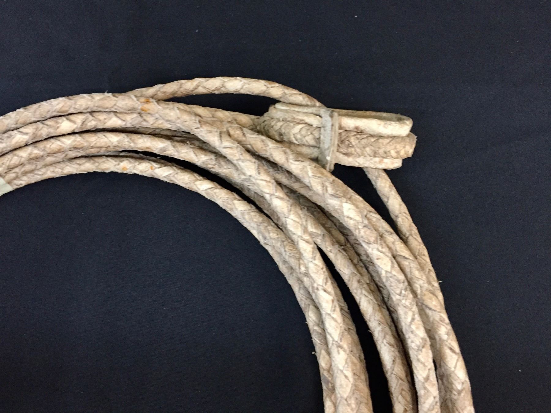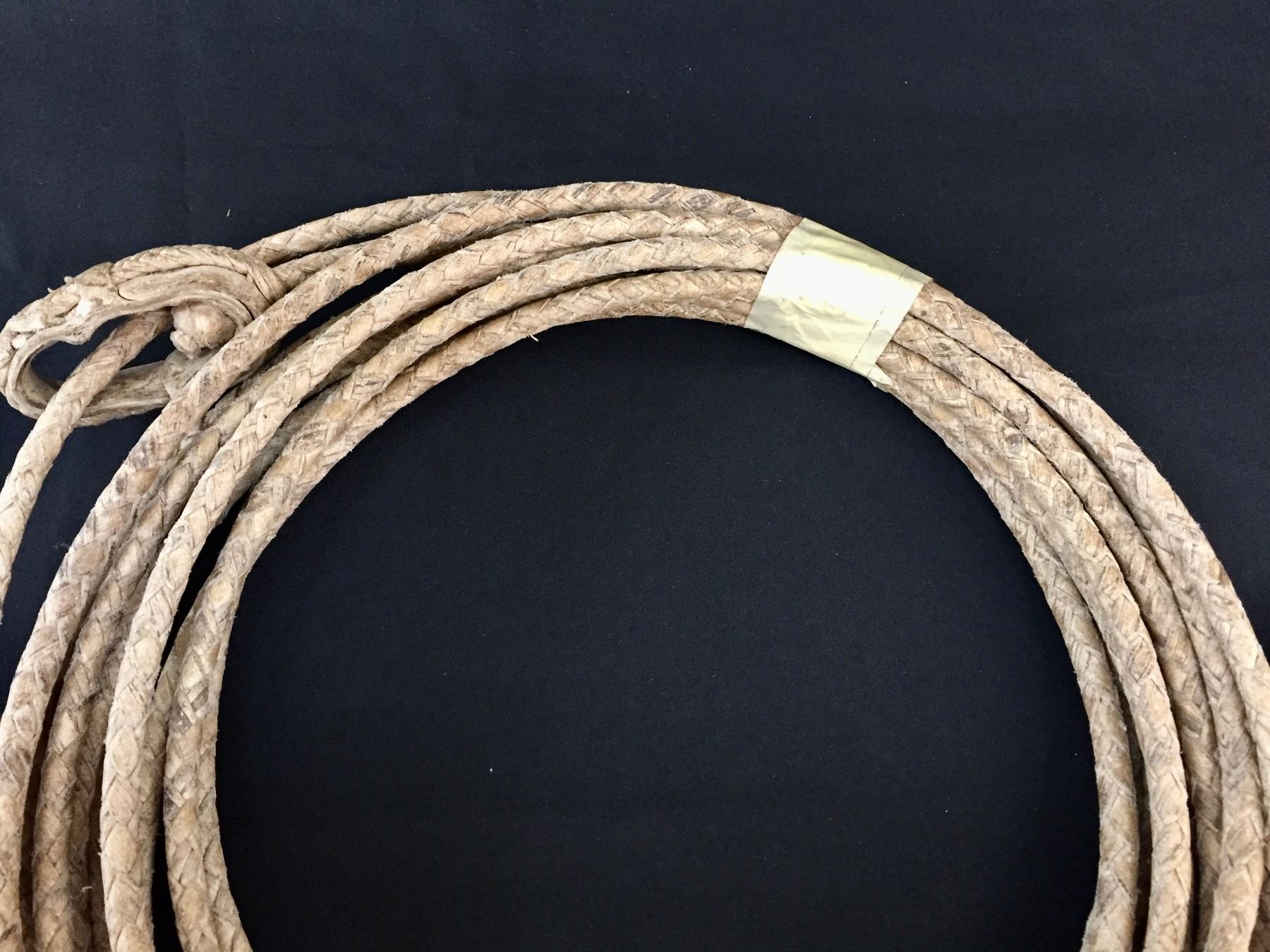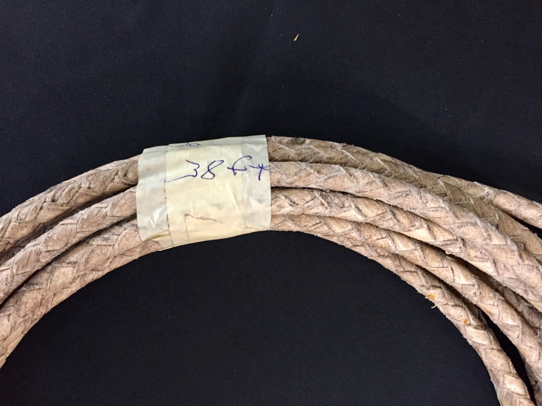 Description: For sale in this lot is a 38 foot Riata with a nice Hondo which swivels independently from the rope. Braided with 4 strands.                                                                                                           Maker: Unknown.                                                                                                                   Approx. Age: Vintage.                                                                                                            Size: 38 foot.                                                                                                                                                                                                                                 Condition: Good for its age, normal wear expected.                                                                                                                Please look closely at the pictures - they are an important part of our description.                                Shipping: There will be a $7 handling / packaging fee for shipping this lot. The actual cost of postage will be added on top of that.