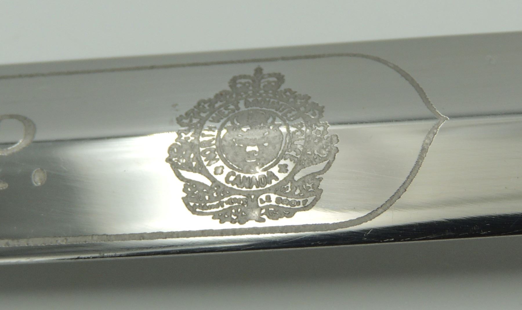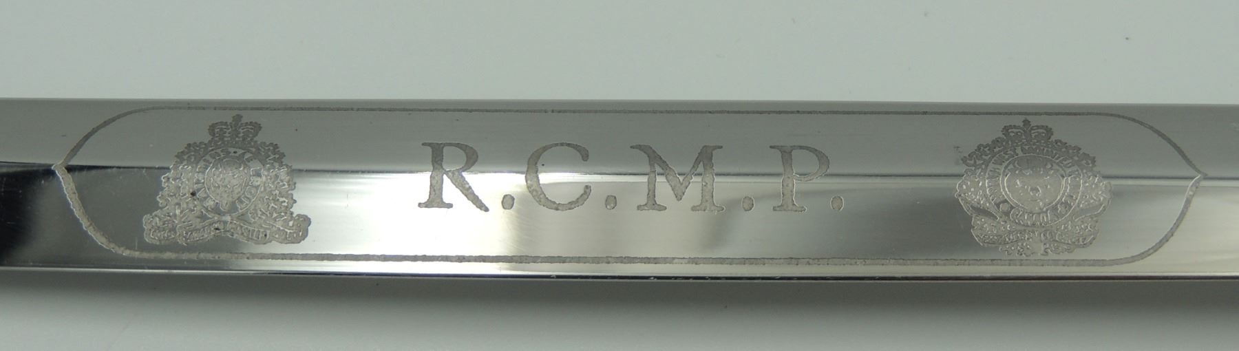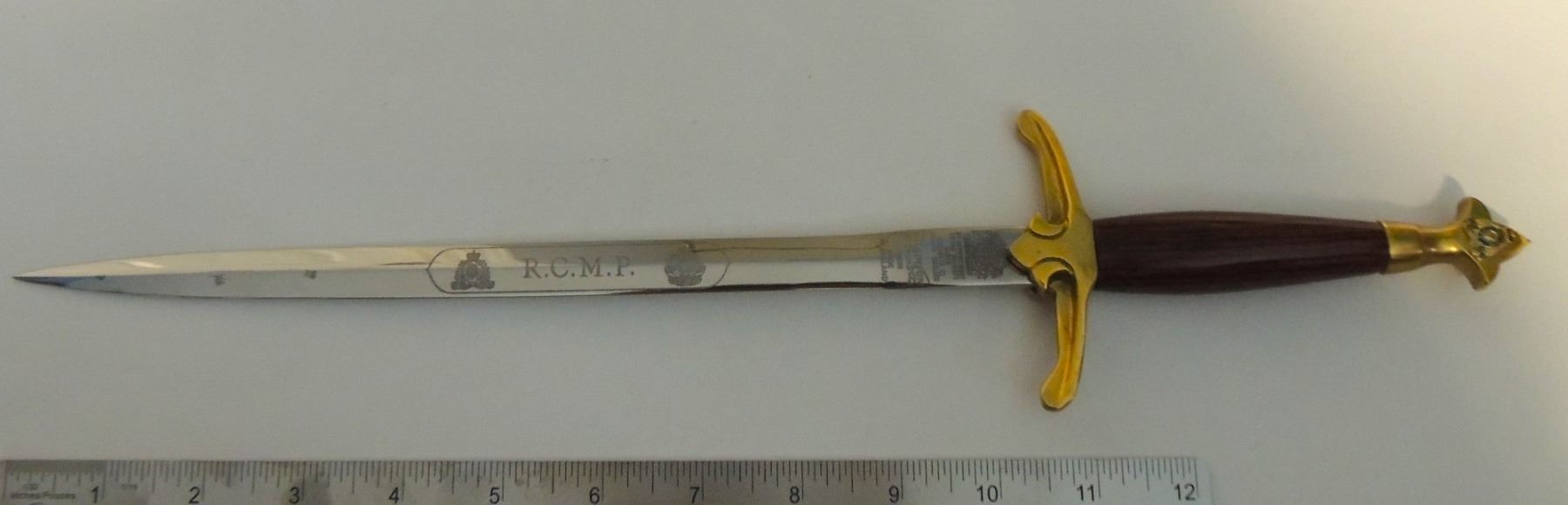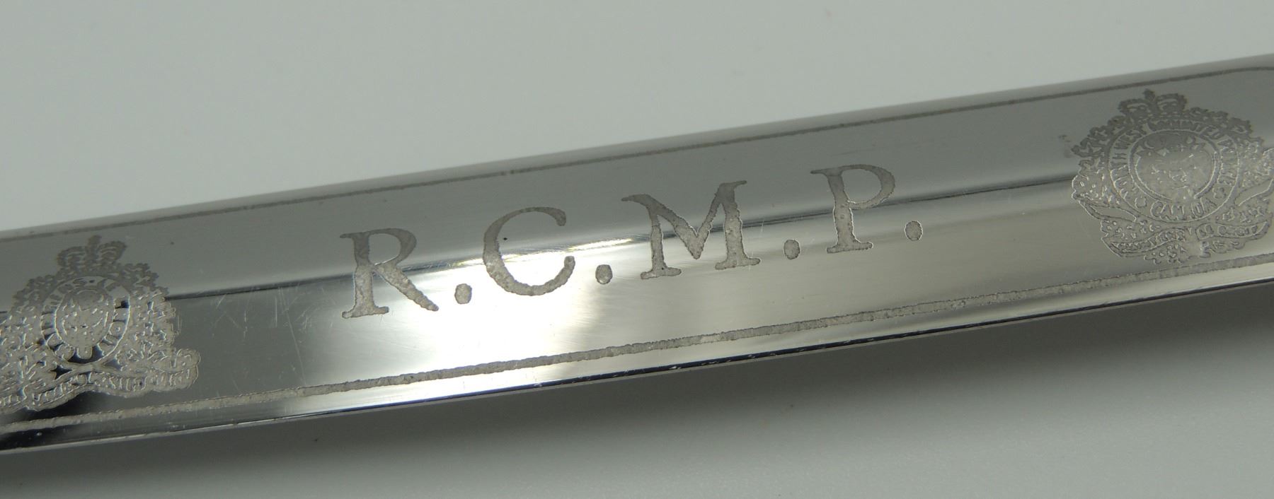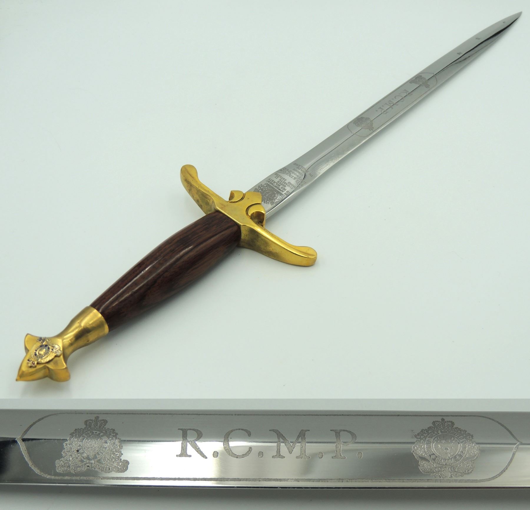 Commemorative Royal Canadian Mounted Police Blade / Dagger.With North West Mounted Police & Queens Crown Royal Canadian Mounted Police Badge Design and center "R.C.M.P." on one side of blade. Seldom Seen, Manufactured by Wilkinson Sword (By Appointment to Her Majesty Queen Elizabeth II Sword Cutters) London, Made in England. Canadian Law Enforcement